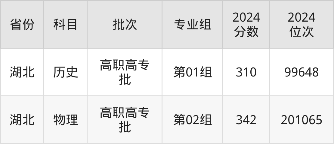 2024年荆门通用航空职业技术学院全国录取分数线是310分到342分,录取最低在湖北历史类(第01组)、录取最高在湖北物理类(第02组)。各省各专业组最低分具有差异,详情如下: