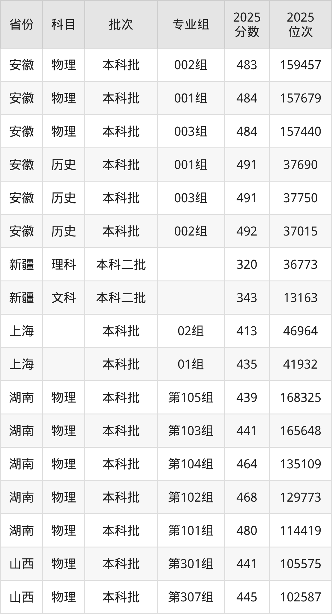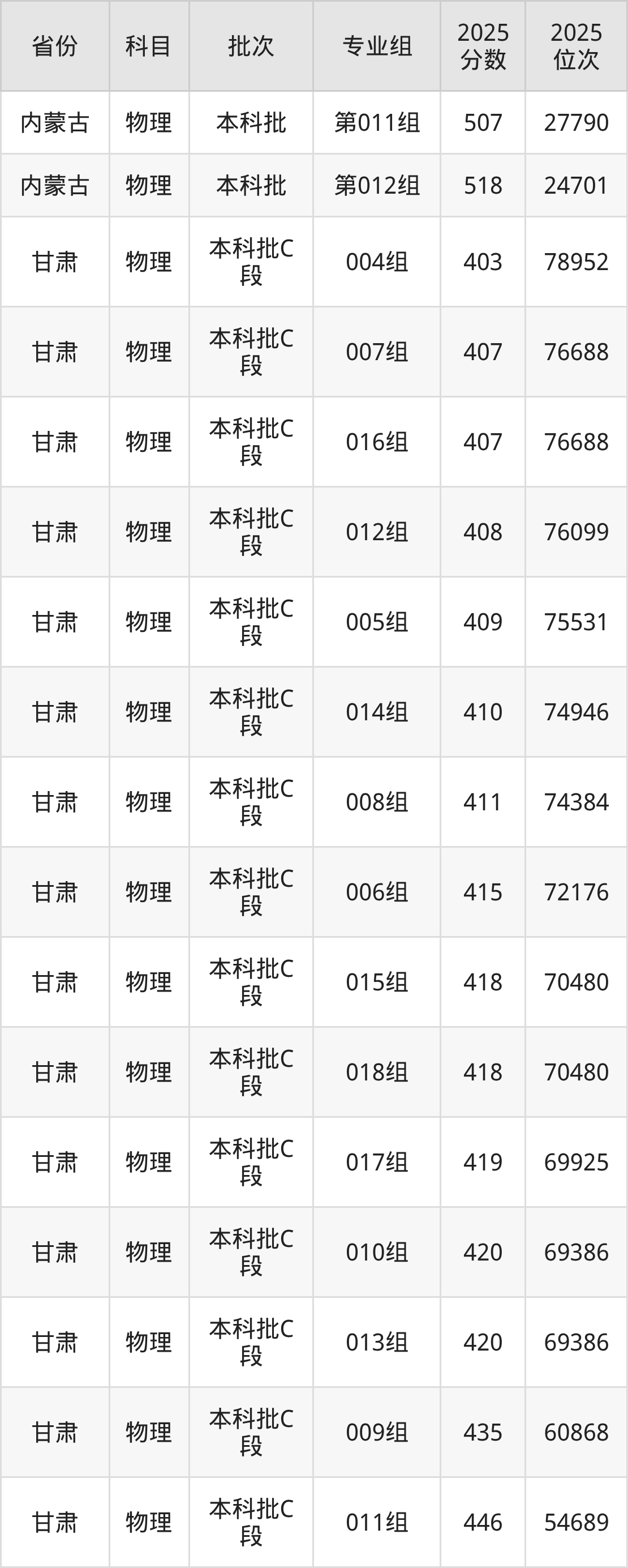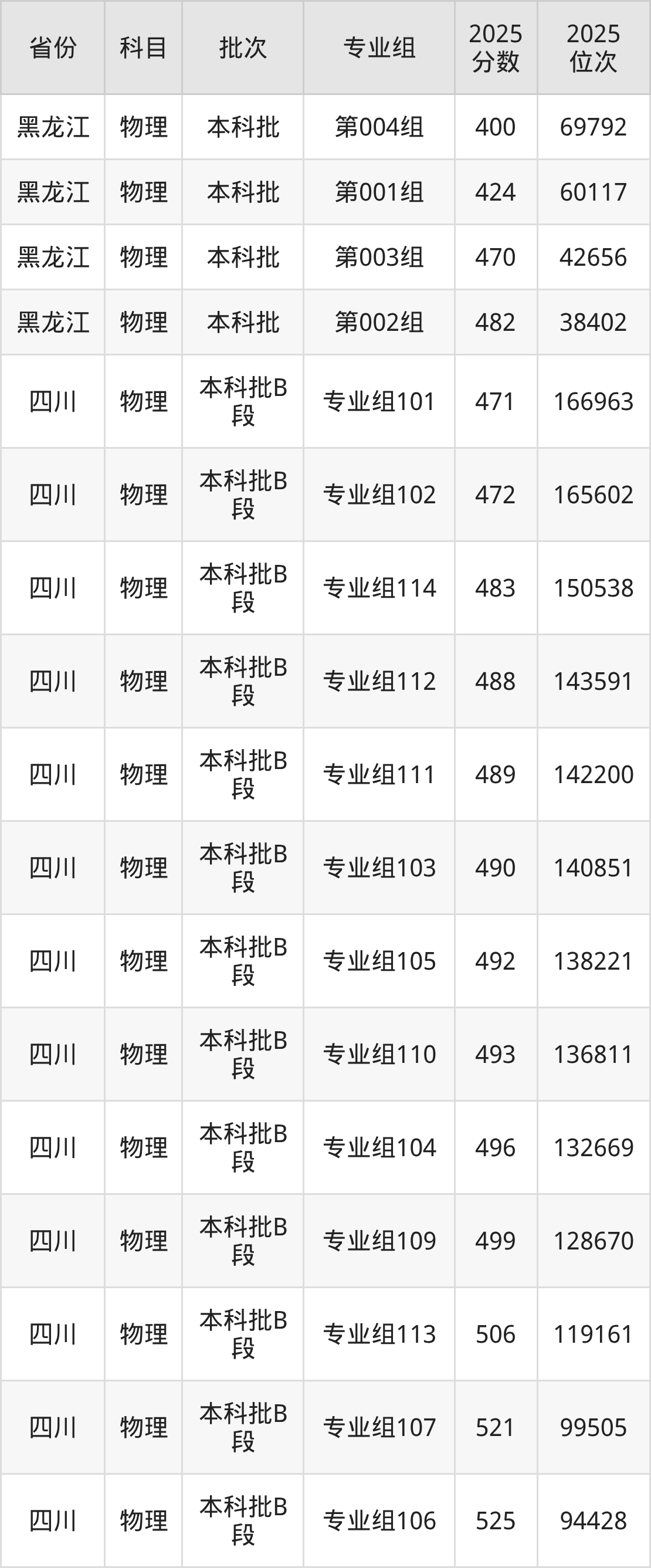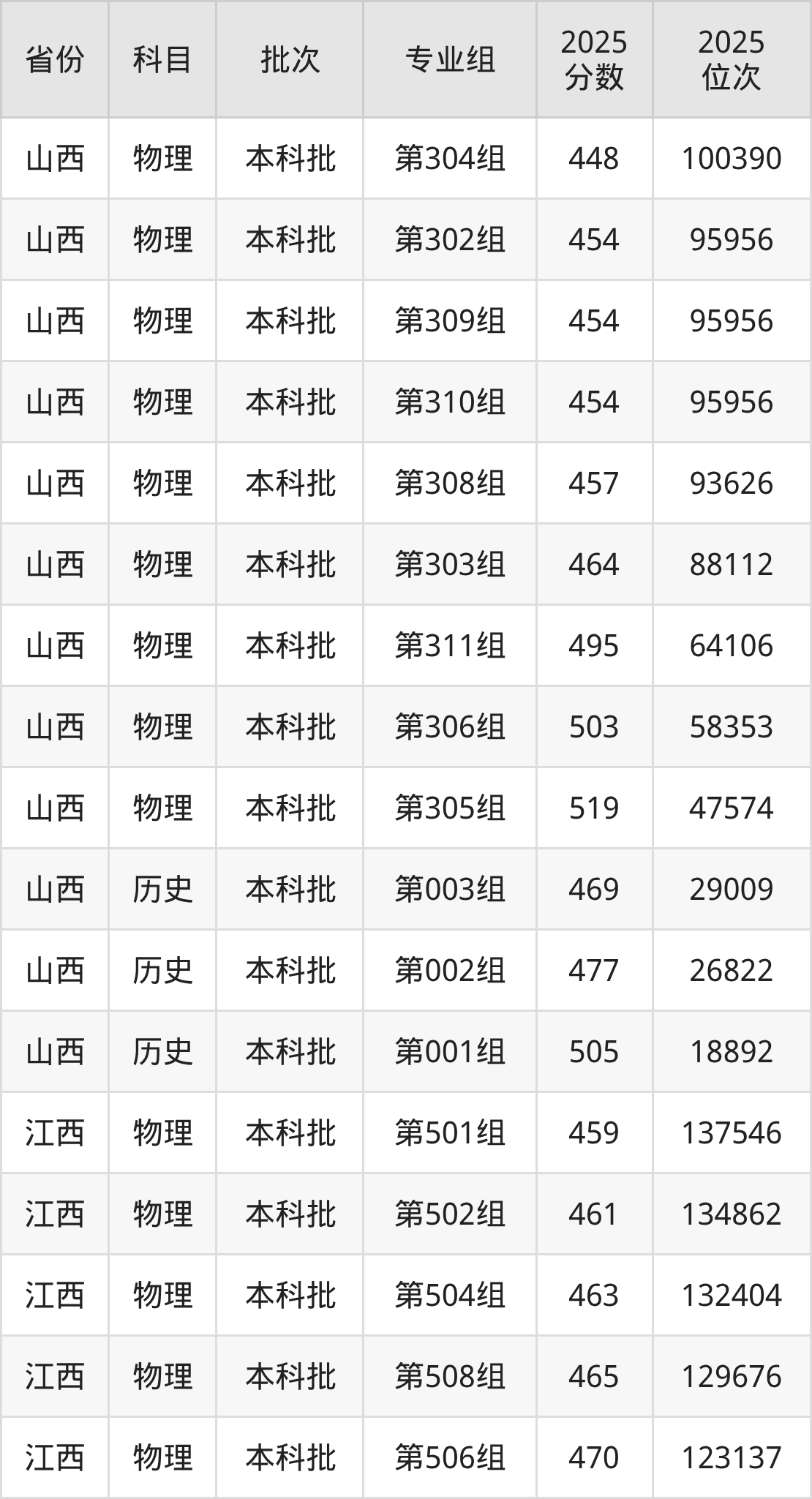 2025年在本科物理类进行招生,各专业组分数线详情如下: