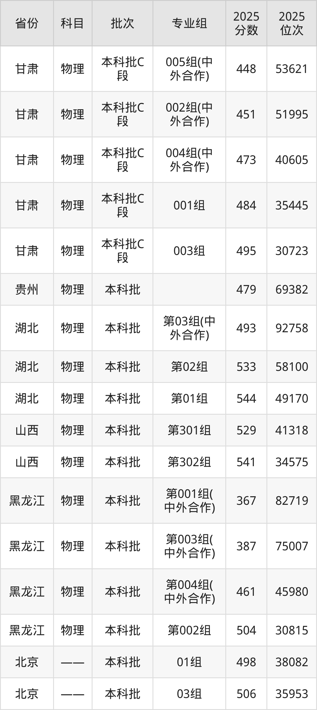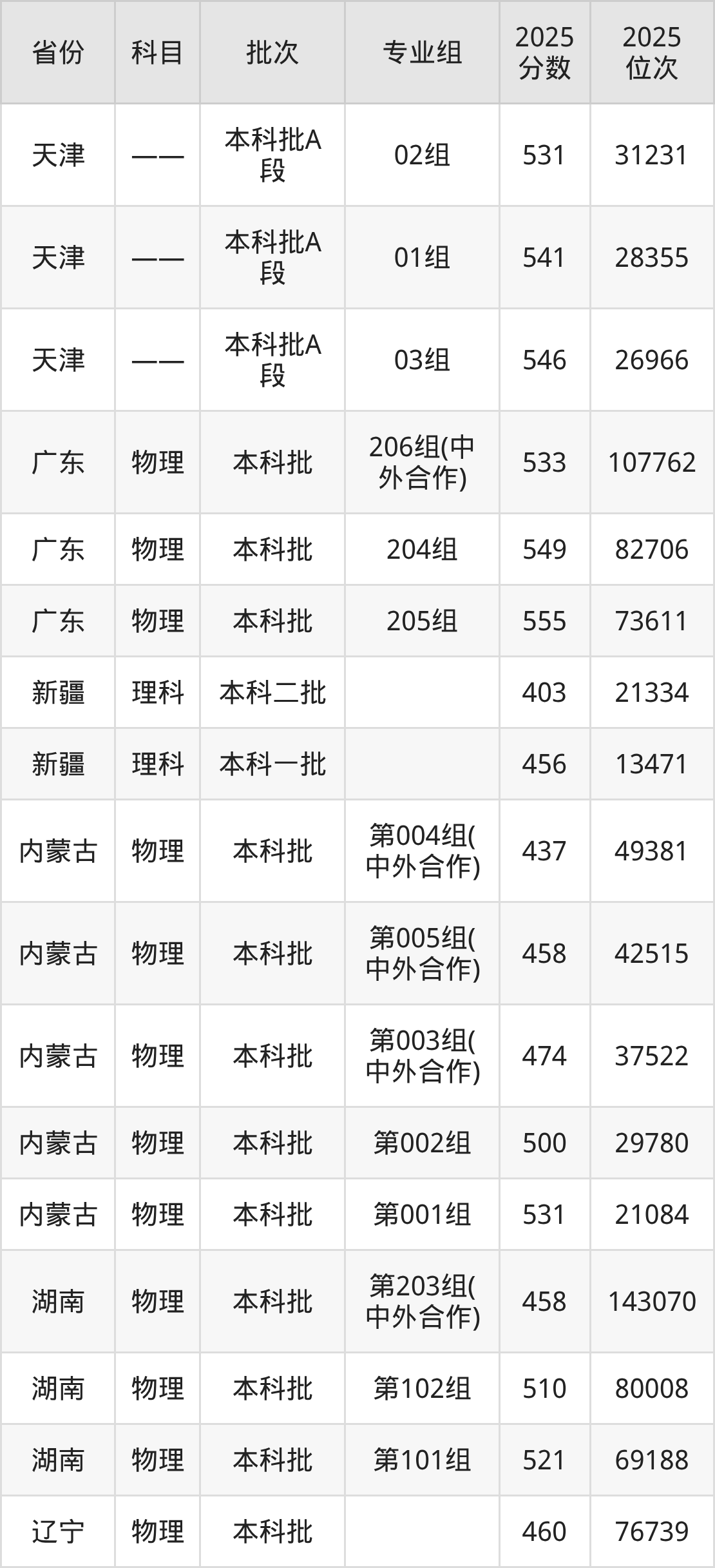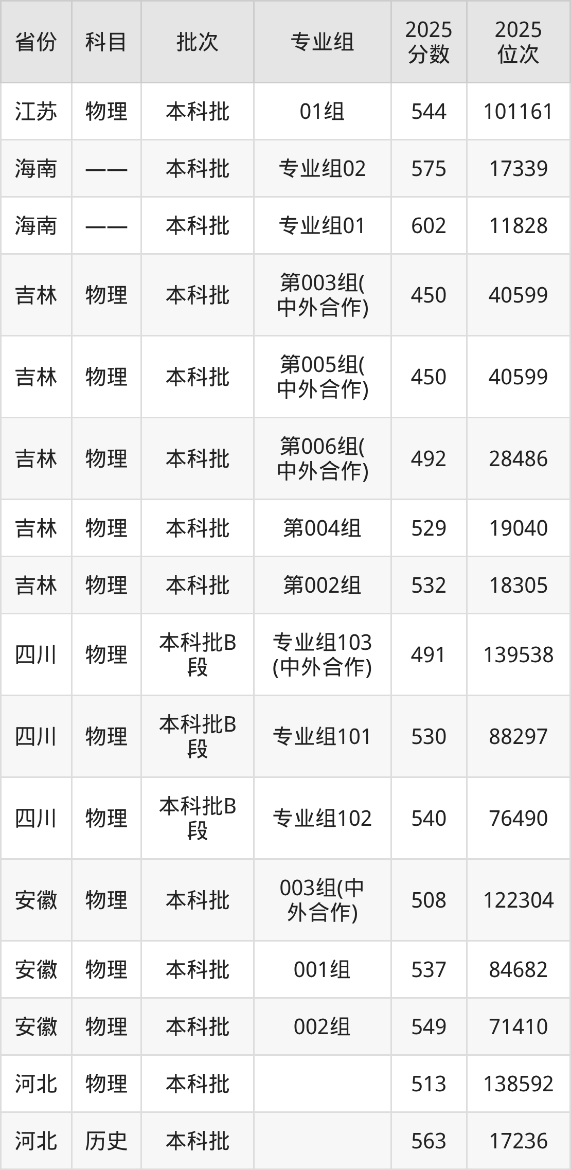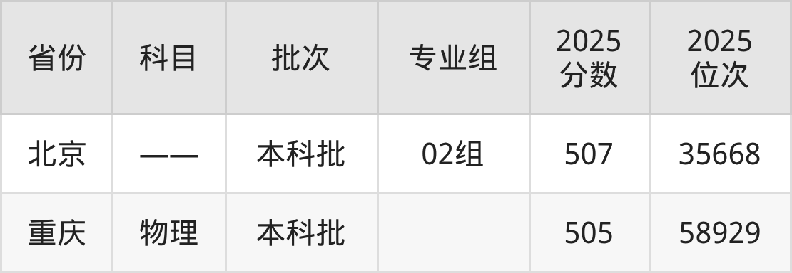 2025年在本科物理类进行招生,各专业组分数线详情如下: