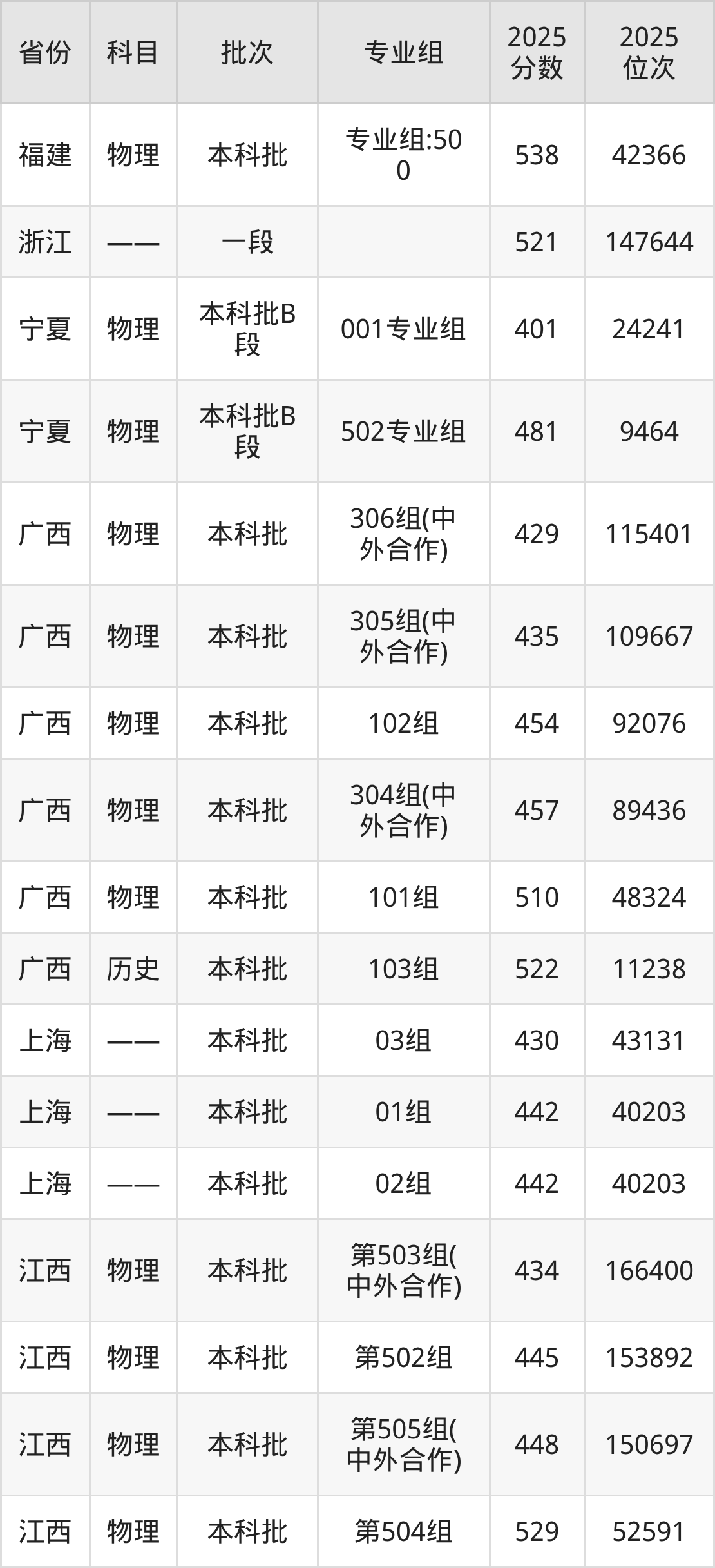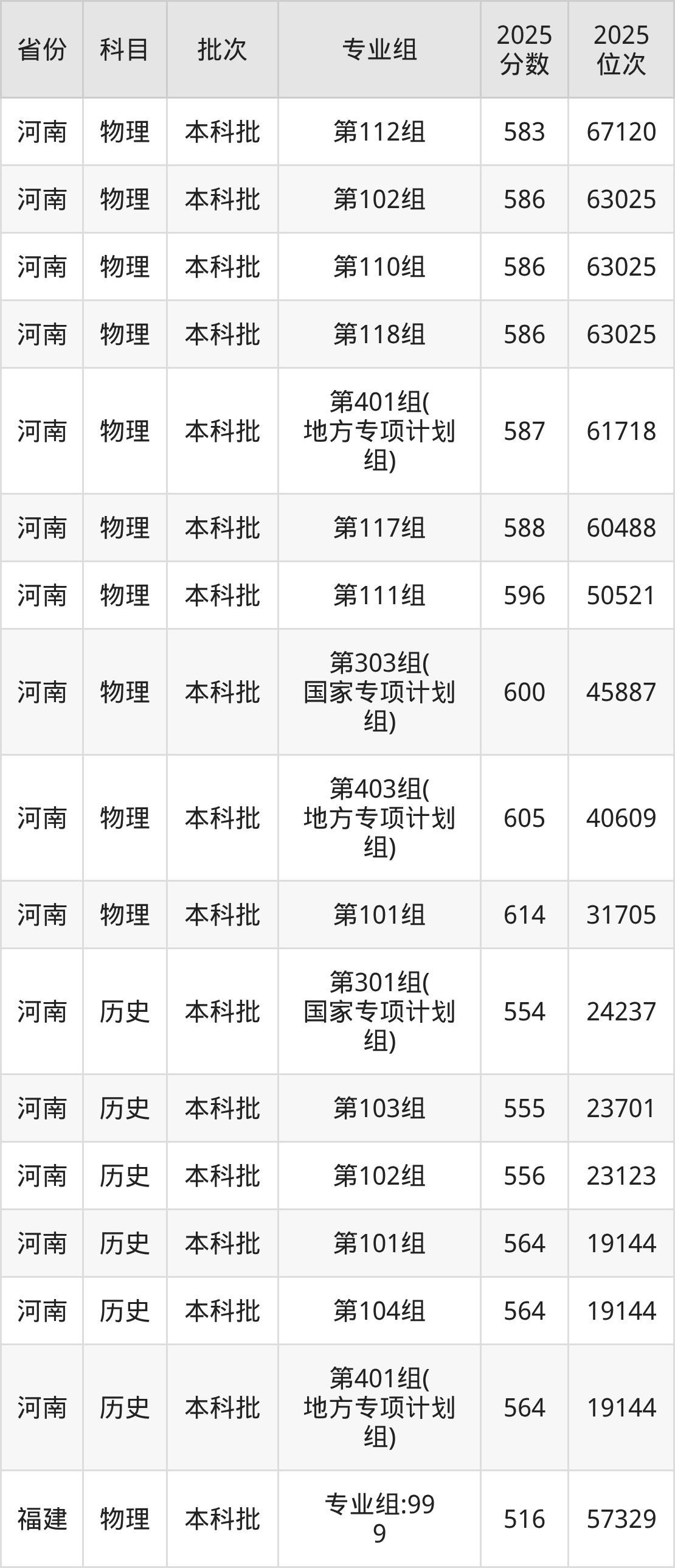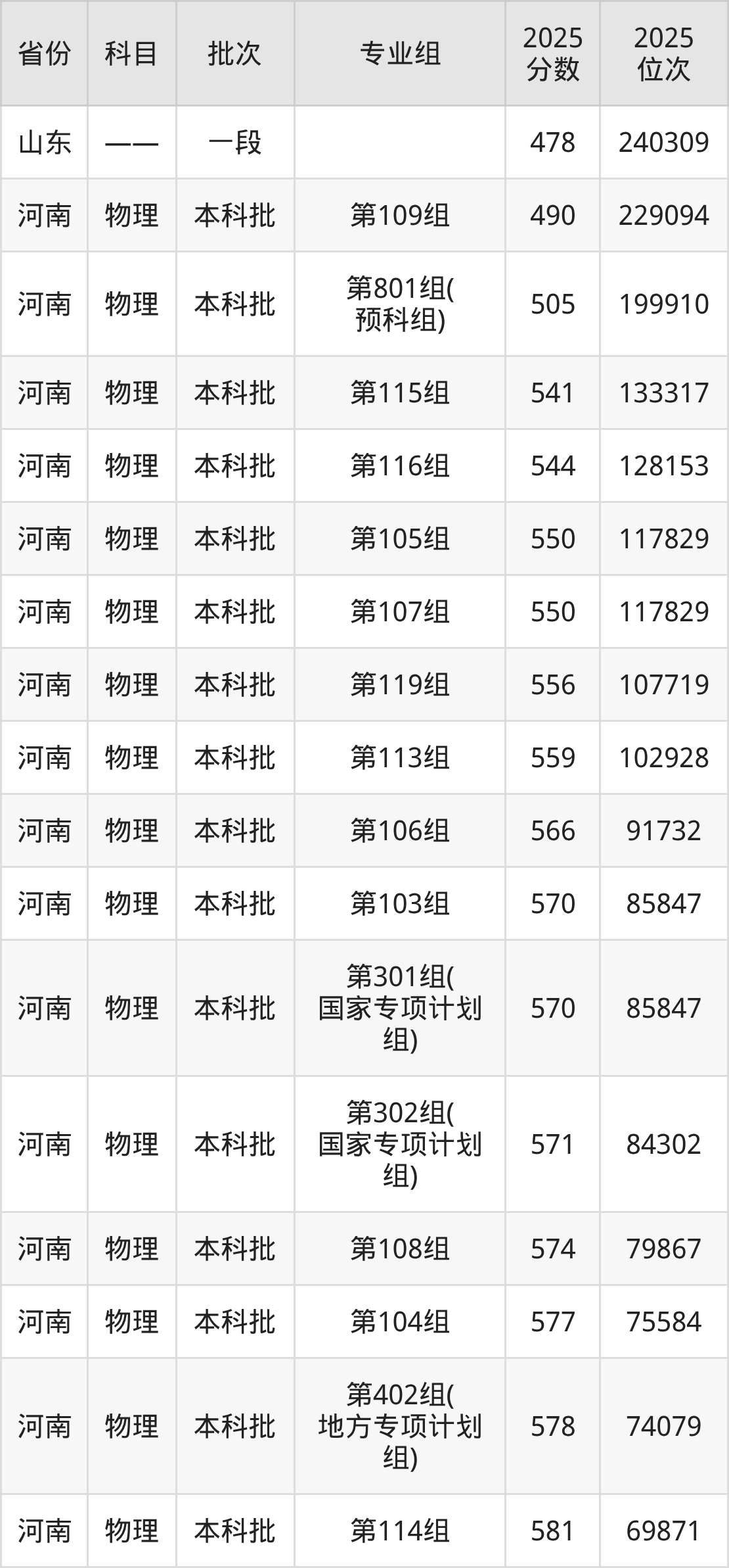 2025年在本科物理类进行招生,各专业组分数线详情如下: