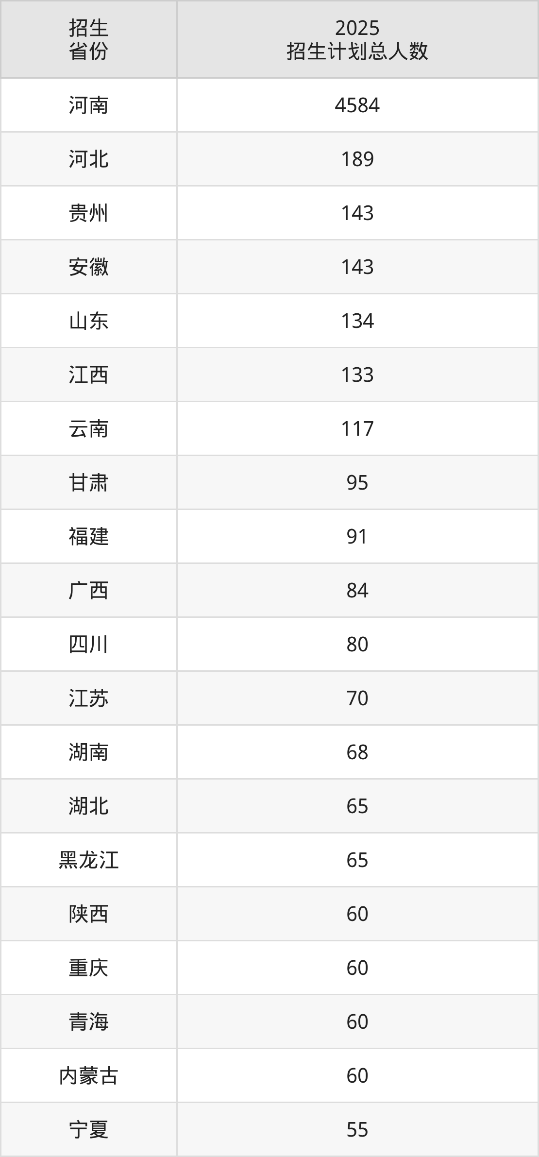2025年华北水利水电大学面向全国29个省市开展本科招生;招生专业共66个,招生人数共6698人。2025年在河南省招生计划总人数是4584人,其中,华北水利水电大学在河南省招生人数最多的是计算机科学与技术。华北水利水电大学在各省具体招生人数情况如下表。