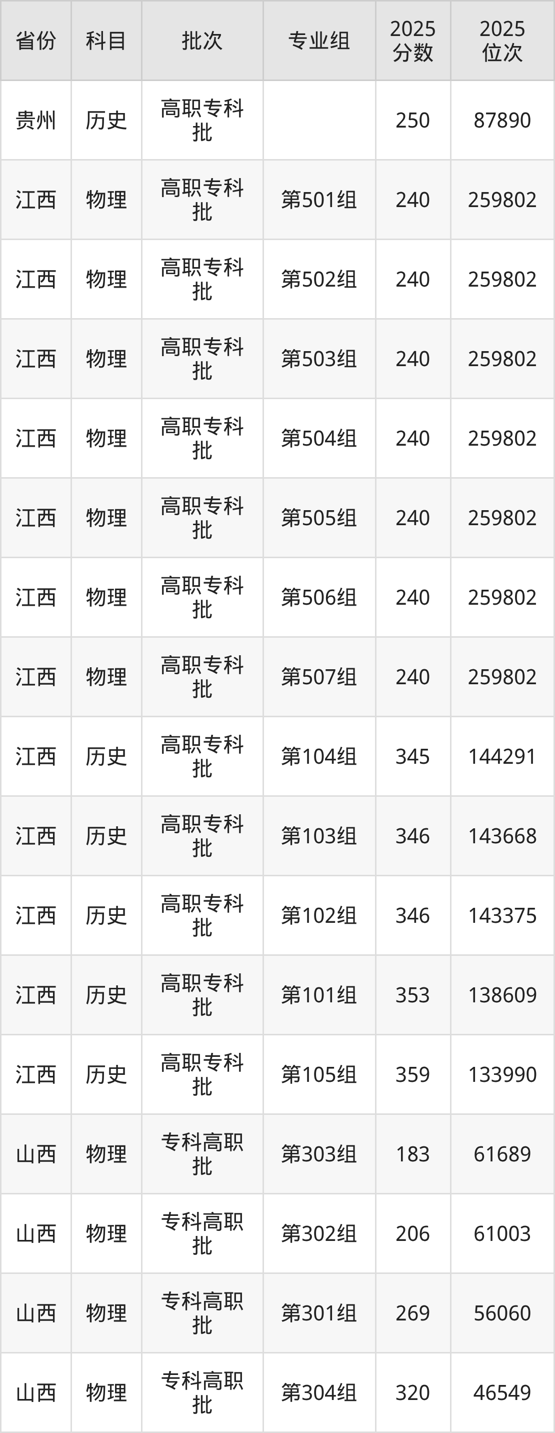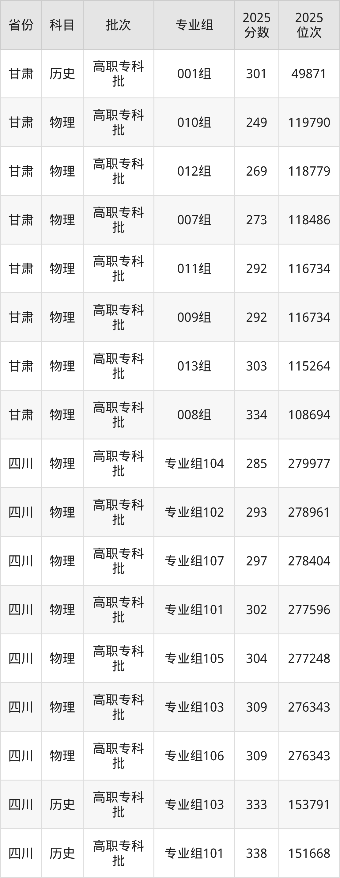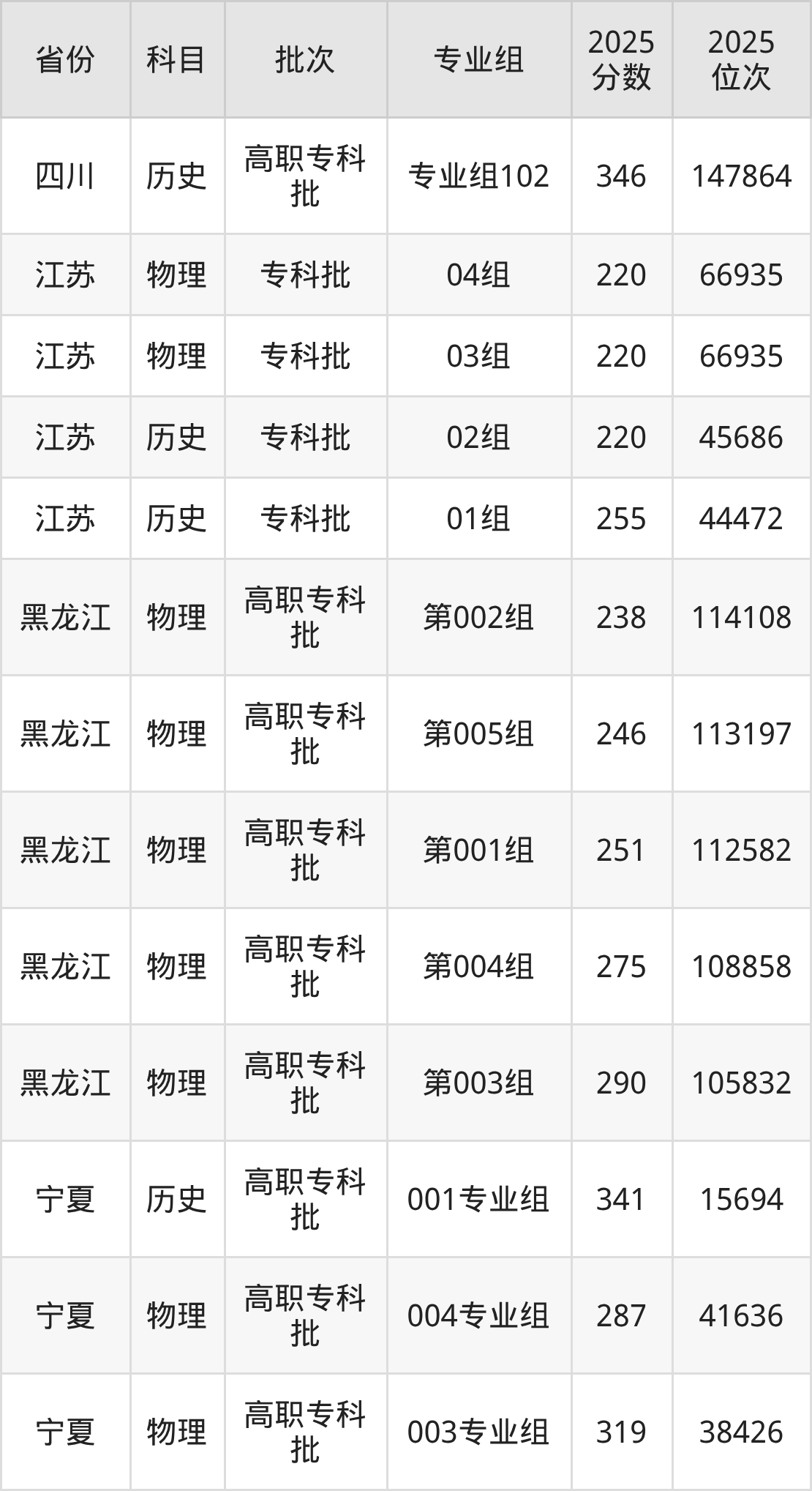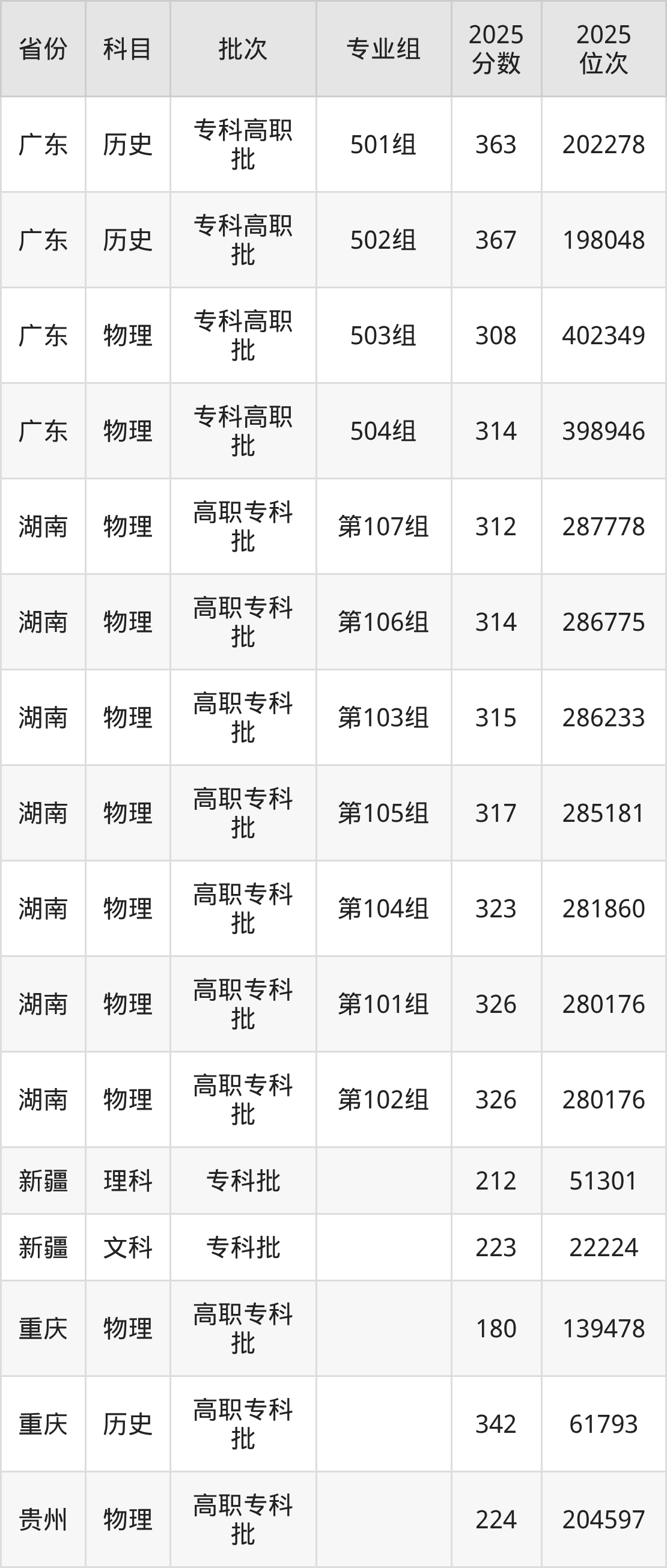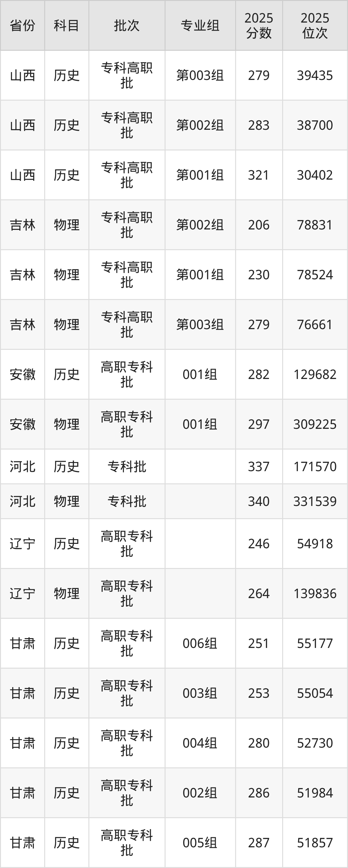 2025年在专科物理类进行招生,各专业组分数线详情如下: