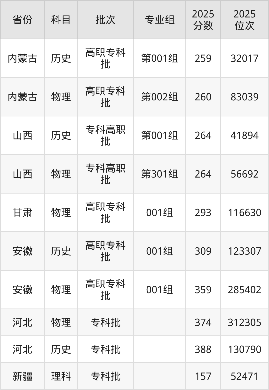 2025年在专科物理类进行招生,各专业组分数线详情如下: