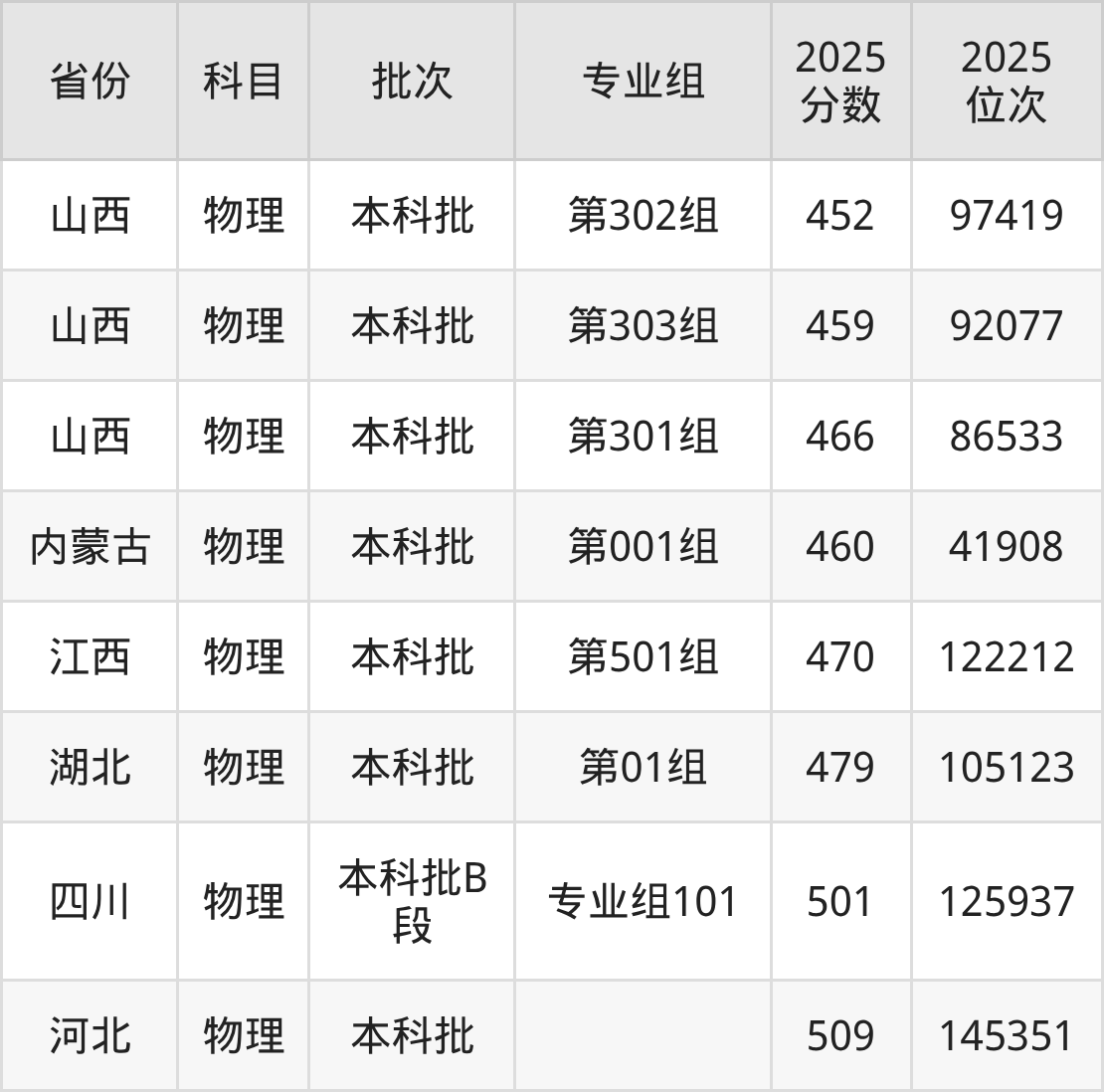 2025年在本科物理类进行招生,各专业组分数线详情如下:
