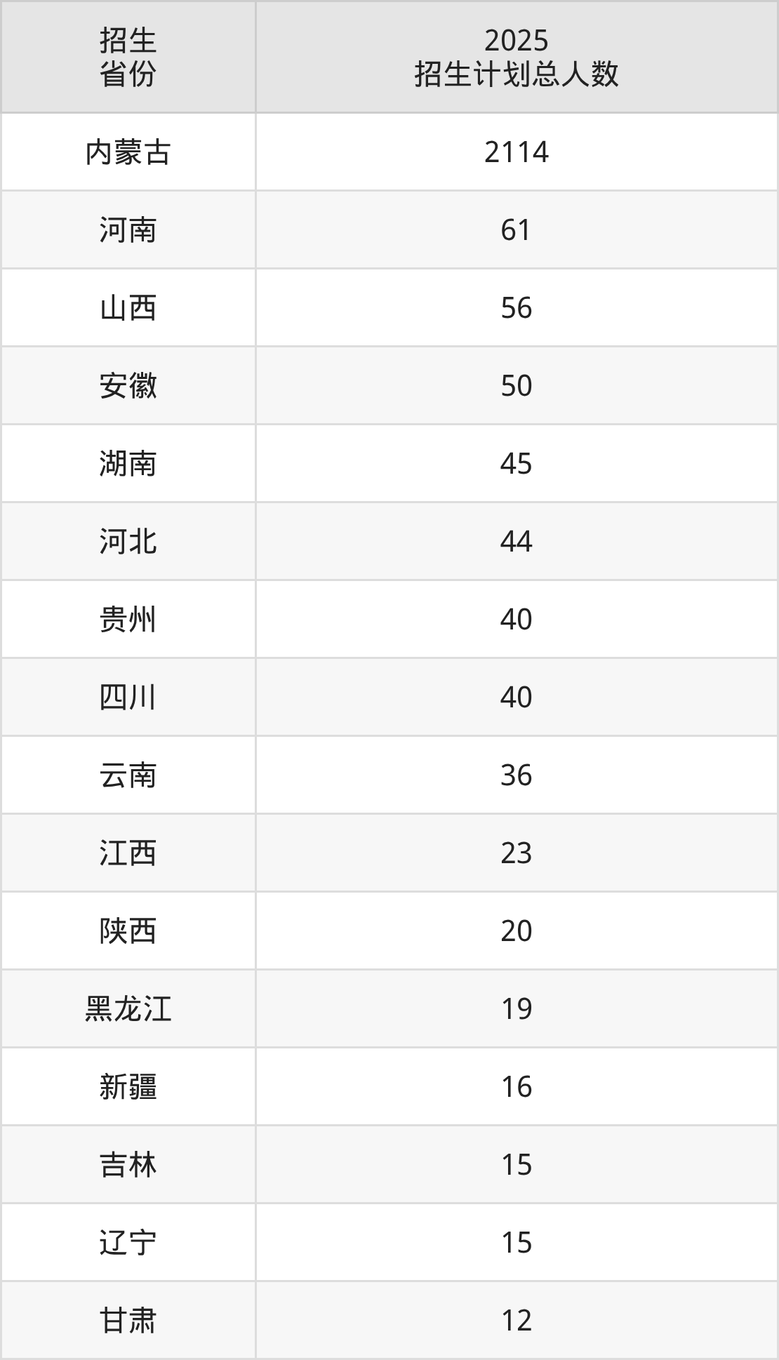 2025年内蒙古财经大学面向全国24个省市开展本科招生;招生专业共45个,招生人数共2660人。2025年在内蒙古自治区招生计划总人数是2114人,其中,内蒙古财经大学在内蒙古自治区招生人数最多的是软件工程。内蒙古财经大学在各省具体招生人数情况如下表。