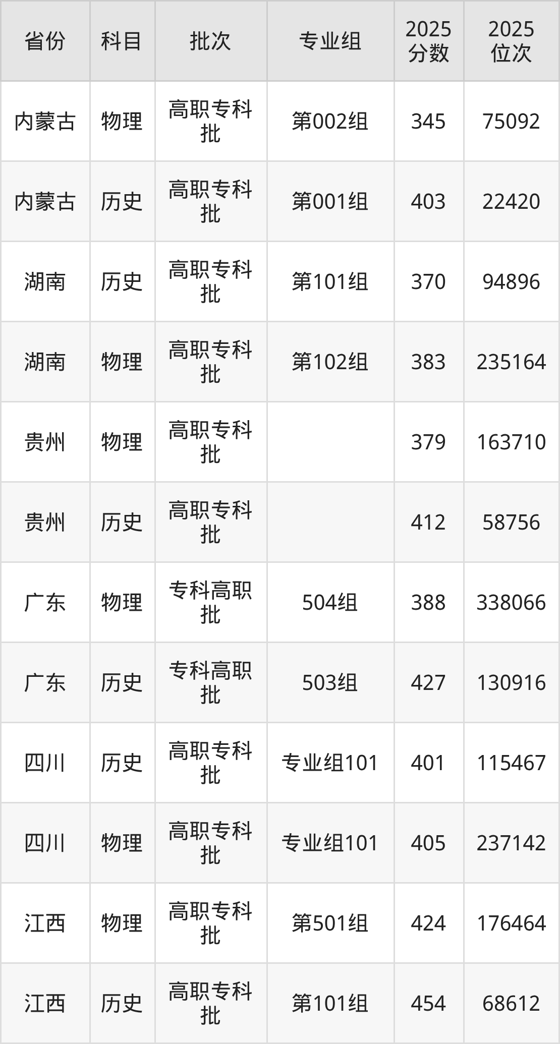 2025年湖南理工职业技术学院全国录取分数线是345分到454分,录取最低在内蒙古物理类(第002组)、录取最高在江西历史类(第101组)。各省各专业组最低分具有差异,详情如下: