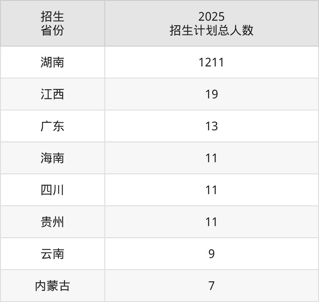 2025年湖南理工职业技术学院面向全国8个省市开展专科招生;招生专业共13个,招生人数共1292人。2025年在湖南省招生计划总人数是1211人,其中,湖南理工职业技术学院在湖南省招生人数最多的是机械设计与制造。湖南理工职业技术学院在各省具体招生人数情况如下表。