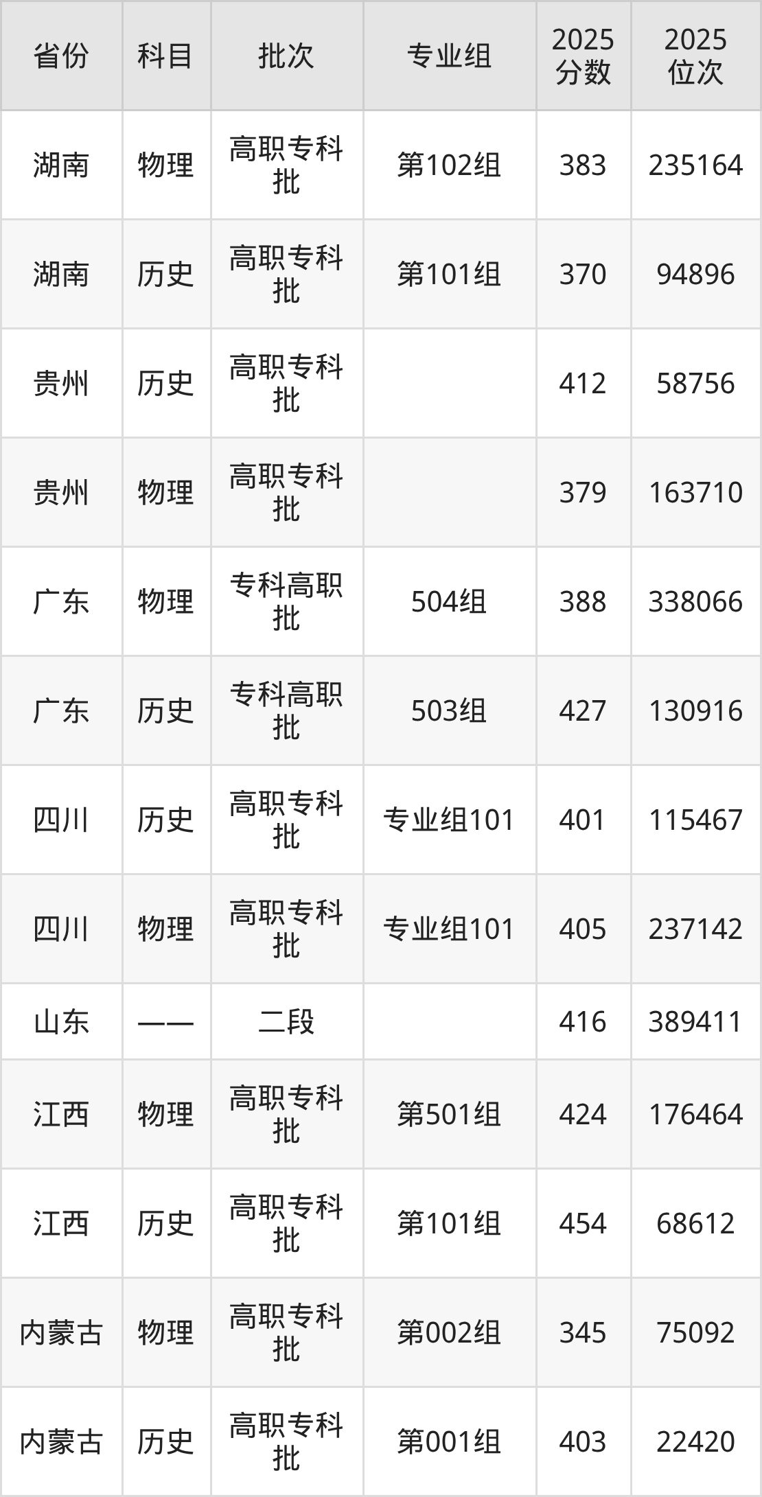 湖南理工职业技术学院第001组:2025年投档录取最低分为403分,录取最低位次为22420名。