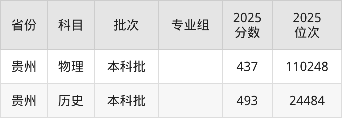 2025年贵州交通职业大学全国录取分数线是437分到493分,录取最低在贵州物理类、录取最高在贵州历史类。