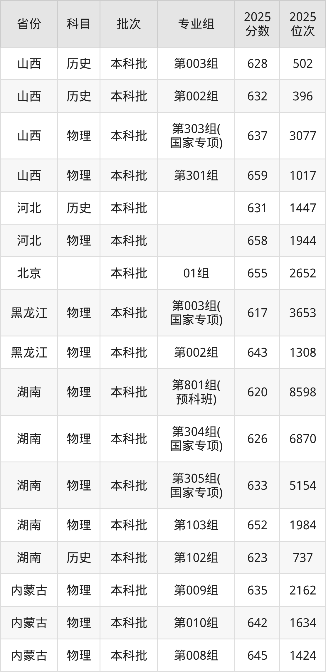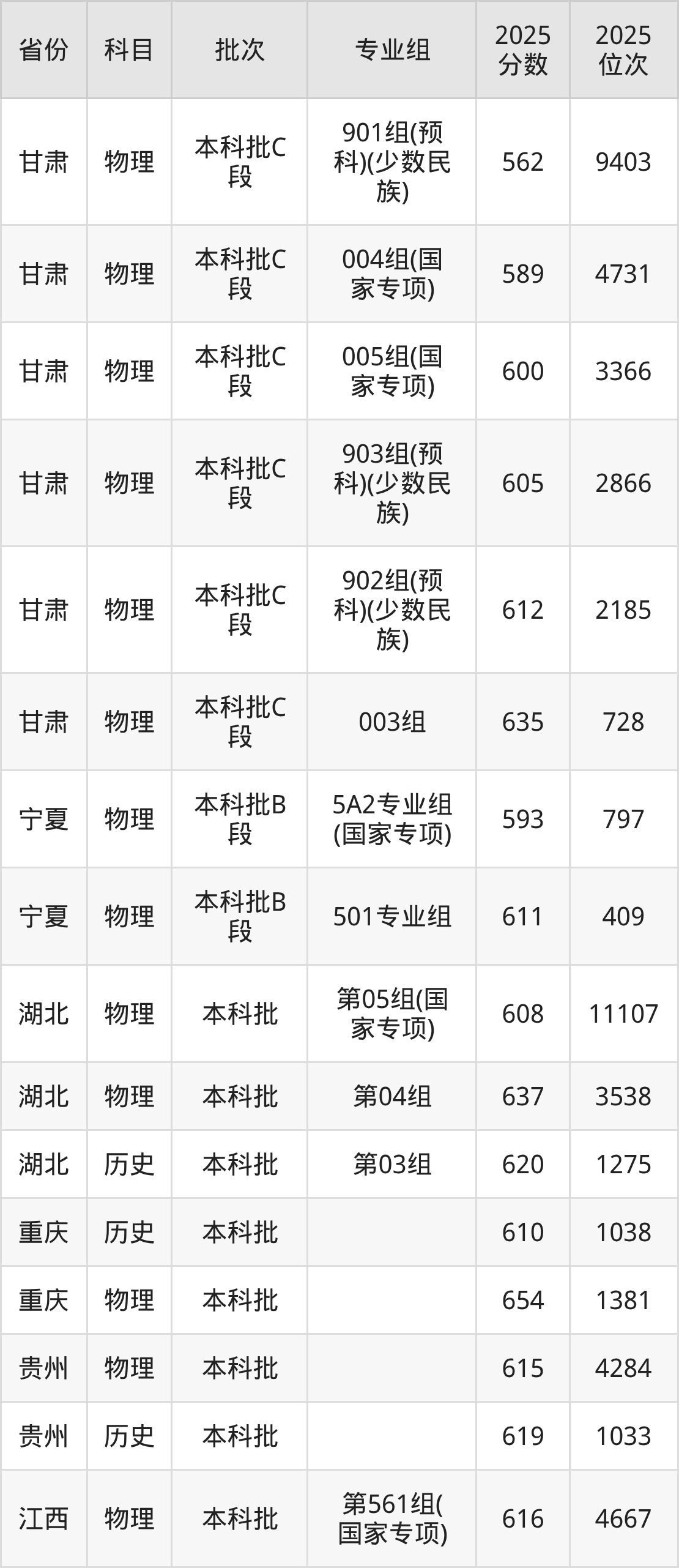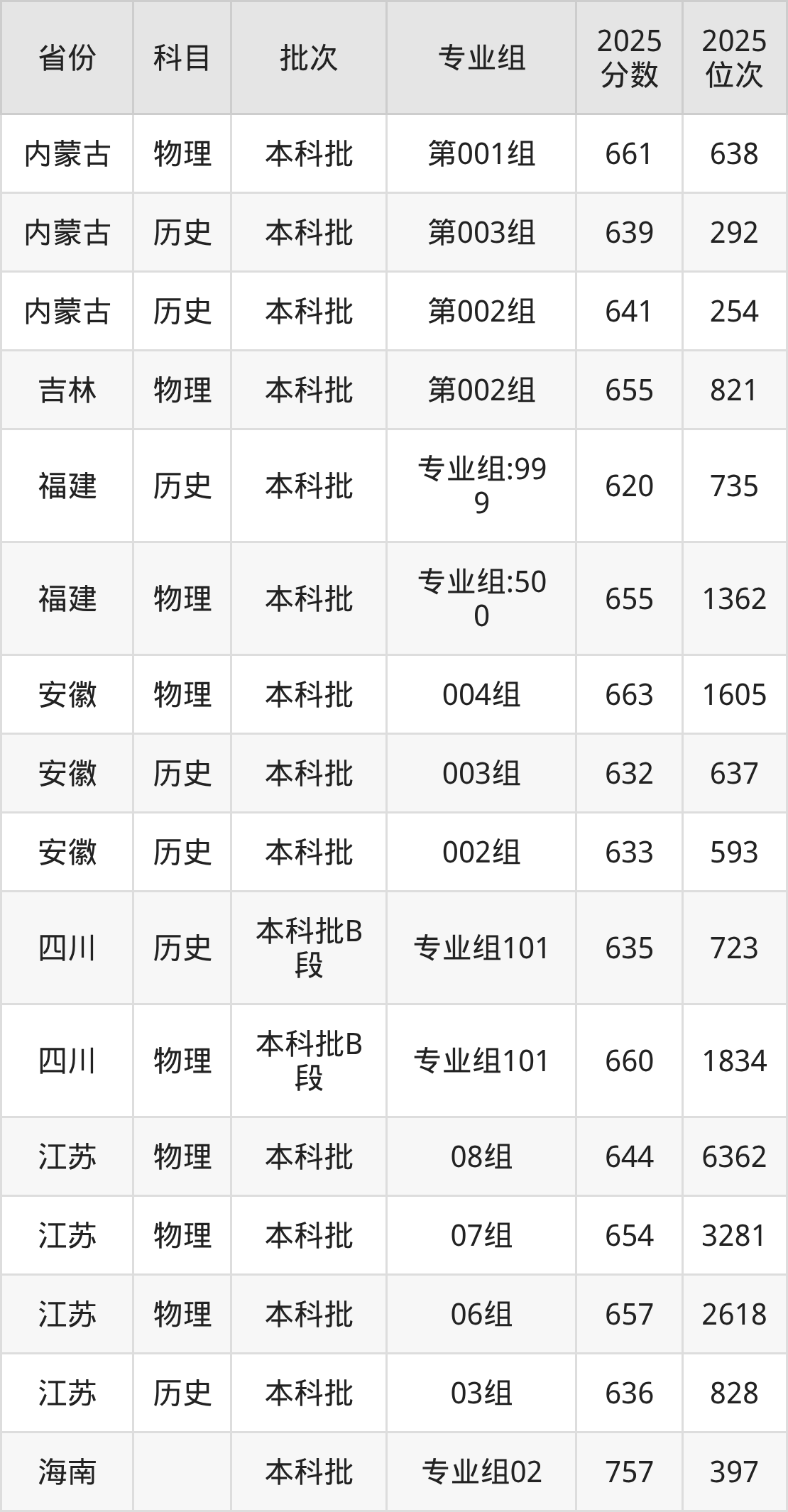 2025年在本科物理类进行招生,各专业组分数线详情如下: