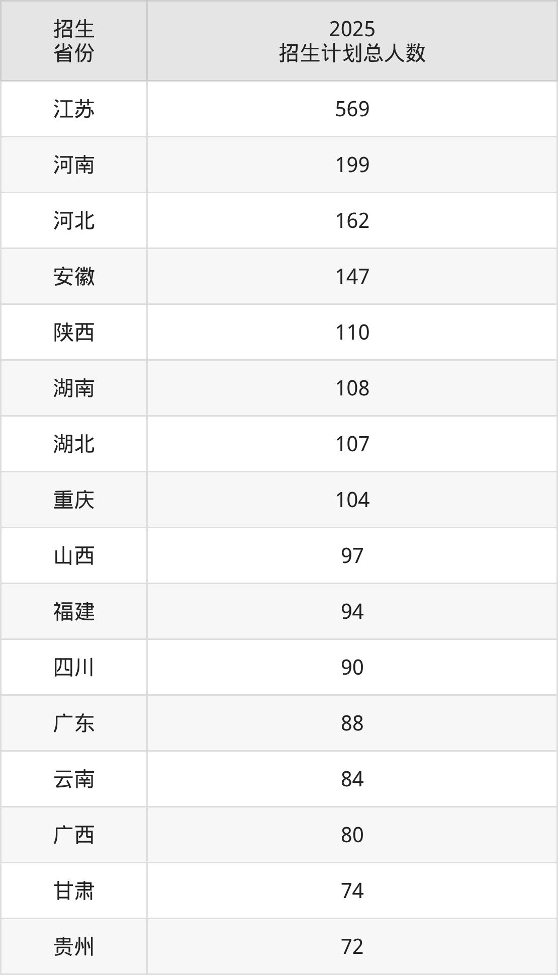 2025年东南大学面向全国28个省市开展本科招生;招生专业共32个,招生人数共2787人。2025年在江苏省招生计划总人数是569人,其中,东南大学在江苏省招生人数最多的是临床医学。东南大学在各省具体招生人数情况如下表。