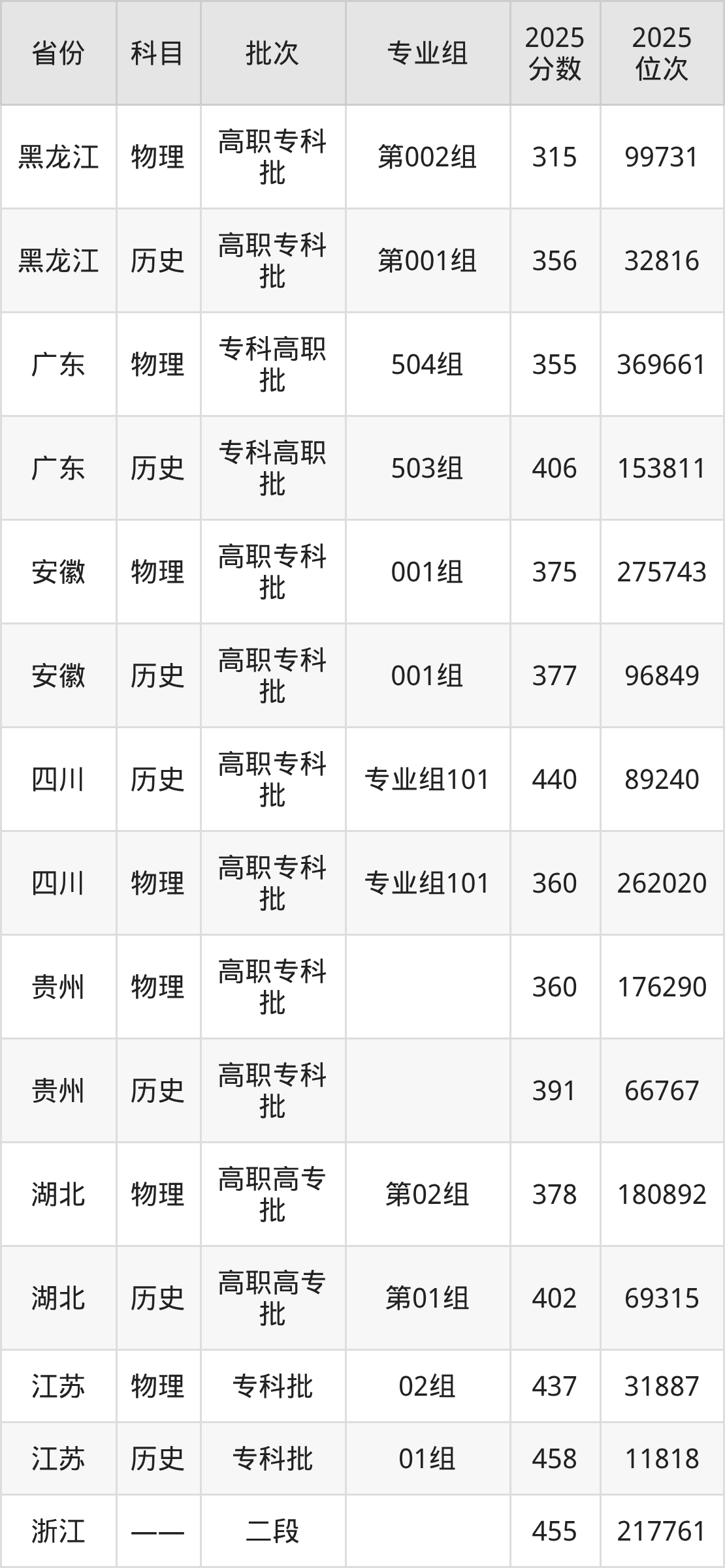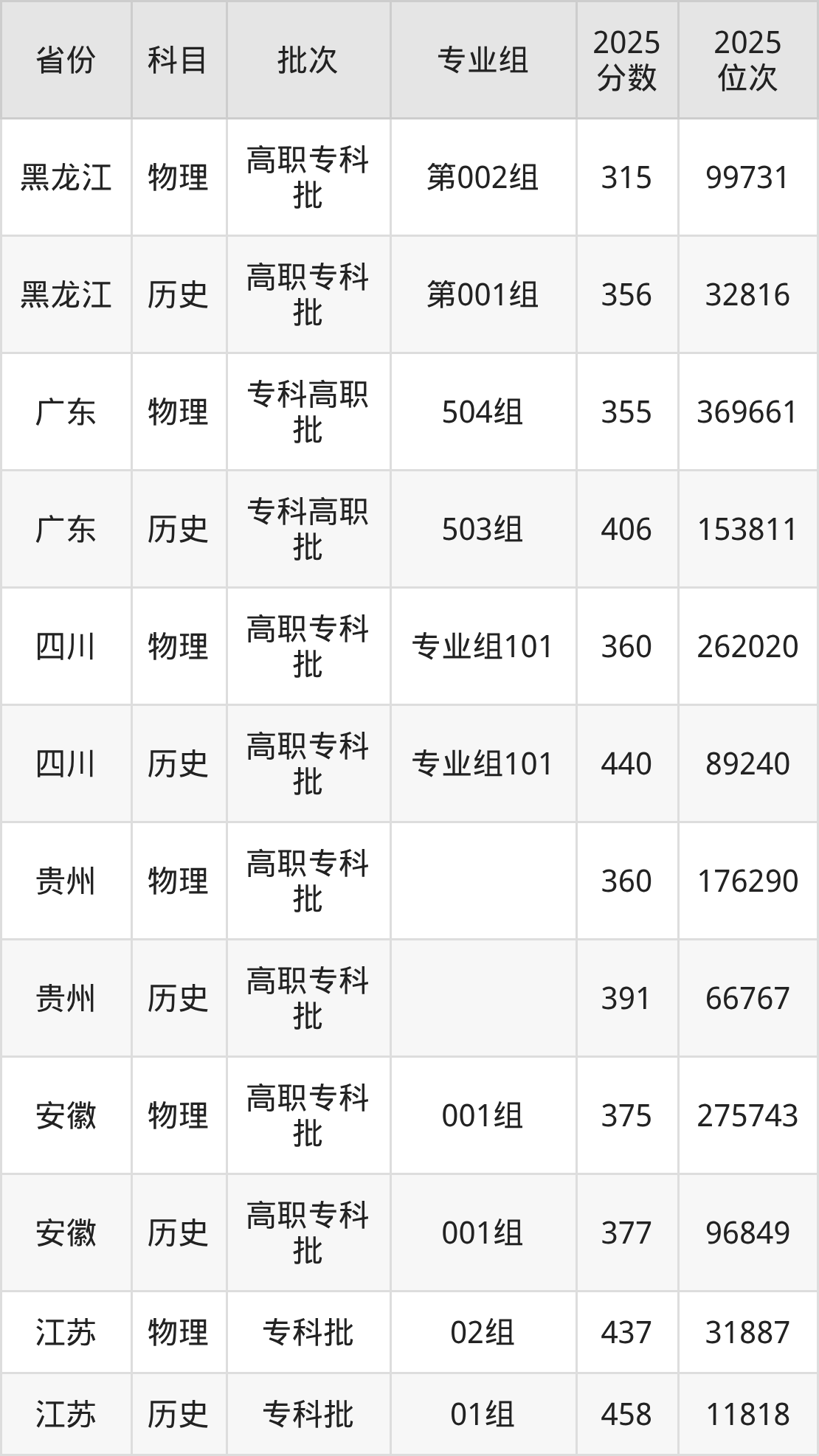 安徽粮食工程职业学院001组:2025年投档录取最低分为375分,录取最低位次为275743名。