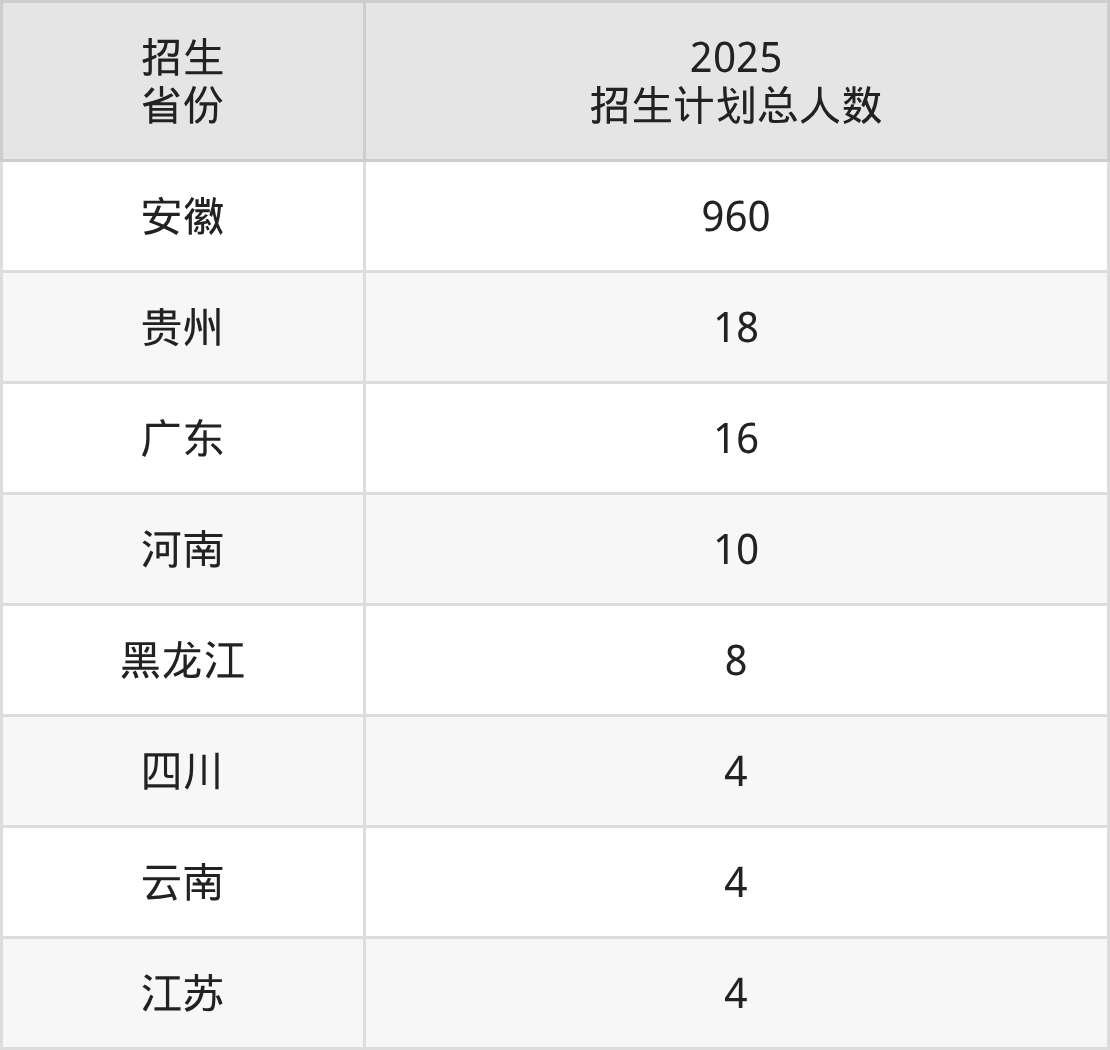 2025年安徽粮食工程职业学院面向全国8个省市开展专科招生;招生专业共37个,招生人数共1024人。2025年在安徽省招生计划总人数是960人,其中,安徽粮食工程职业学院在安徽省招生人数最多的是粮食工程技术与管理。安徽粮食工程职业学院在各省具体招生人数情况如下表。