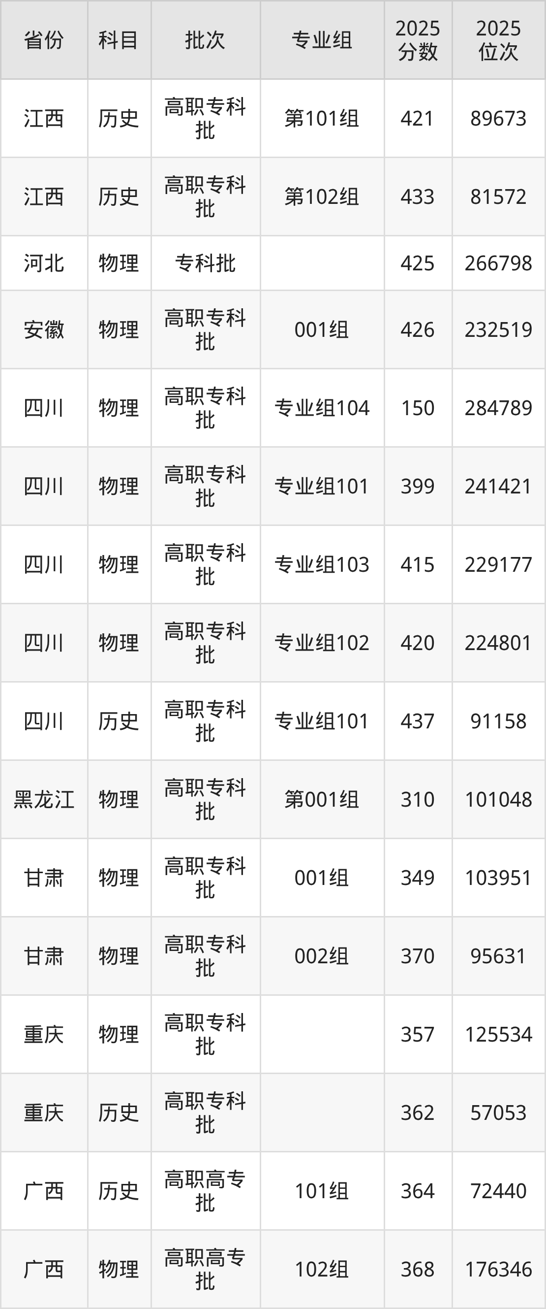 2025年在专科历史类进行招生,各专业组分数线详情如下: