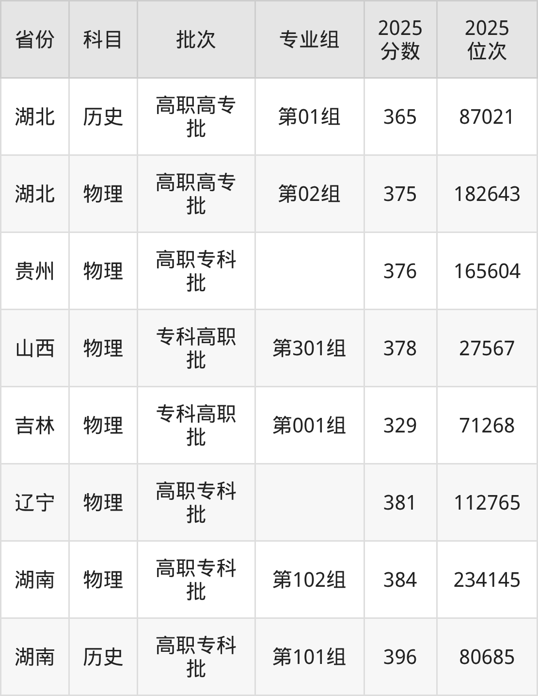 2025年在专科物理类进行招生,各专业组分数线详情如下: