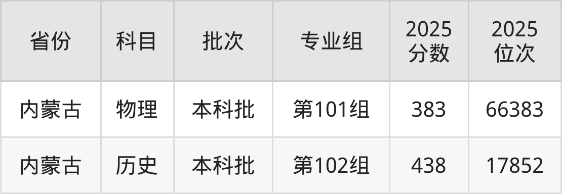 2025年内蒙古建筑职业技术大学全国录取分数线是383分到438分,录取最低在内蒙古物理类(第101组)、录取最高在内蒙古历史类(第102组)。