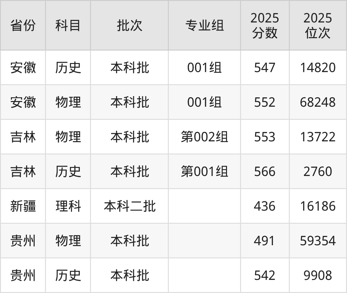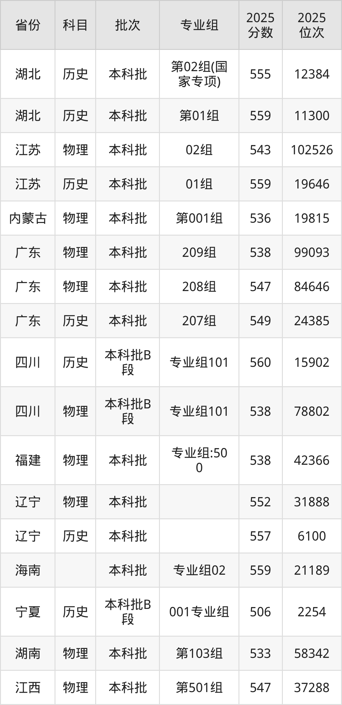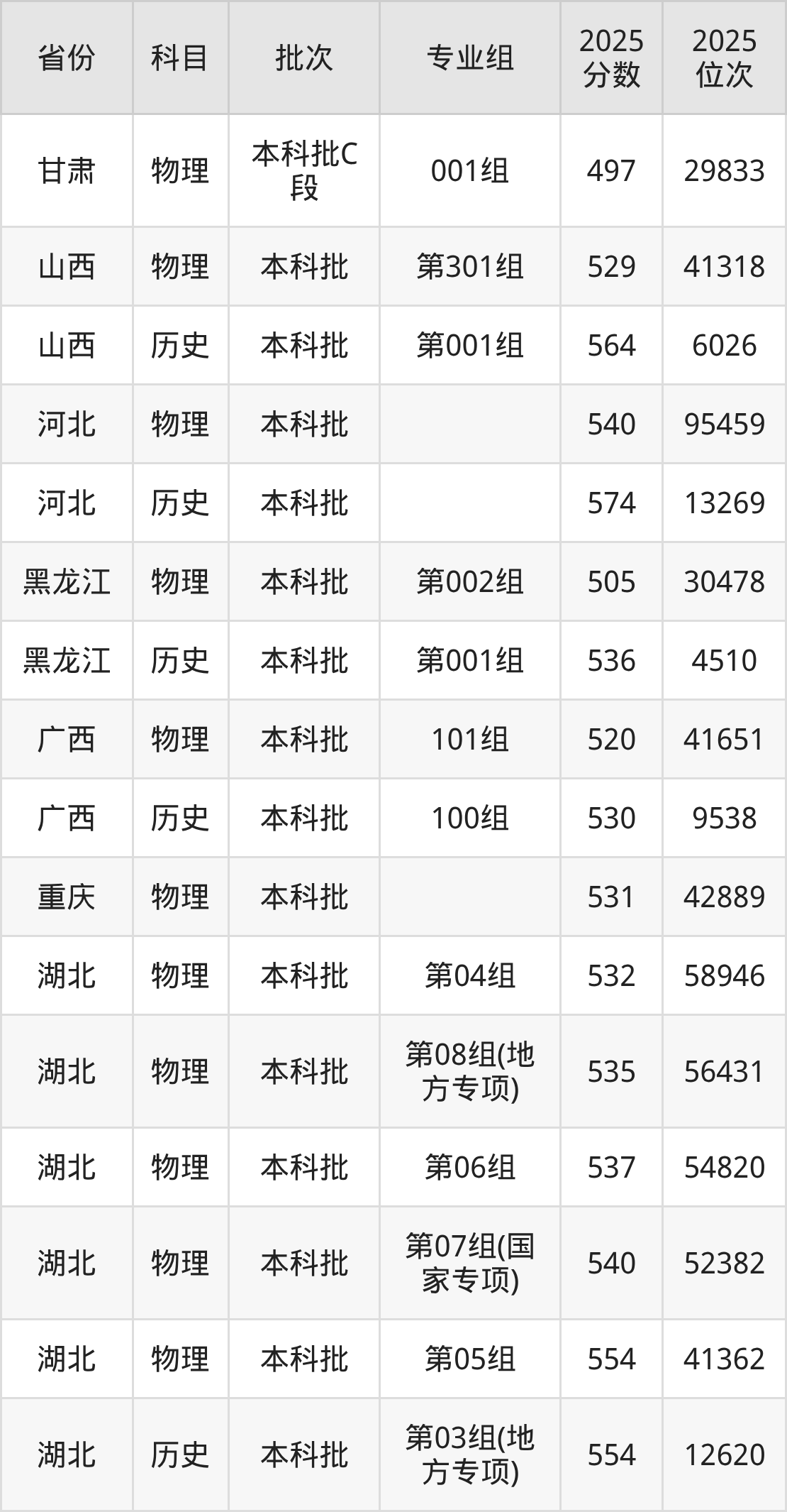 2025年在本科物理类进行招生,各专业组分数线详情如下: