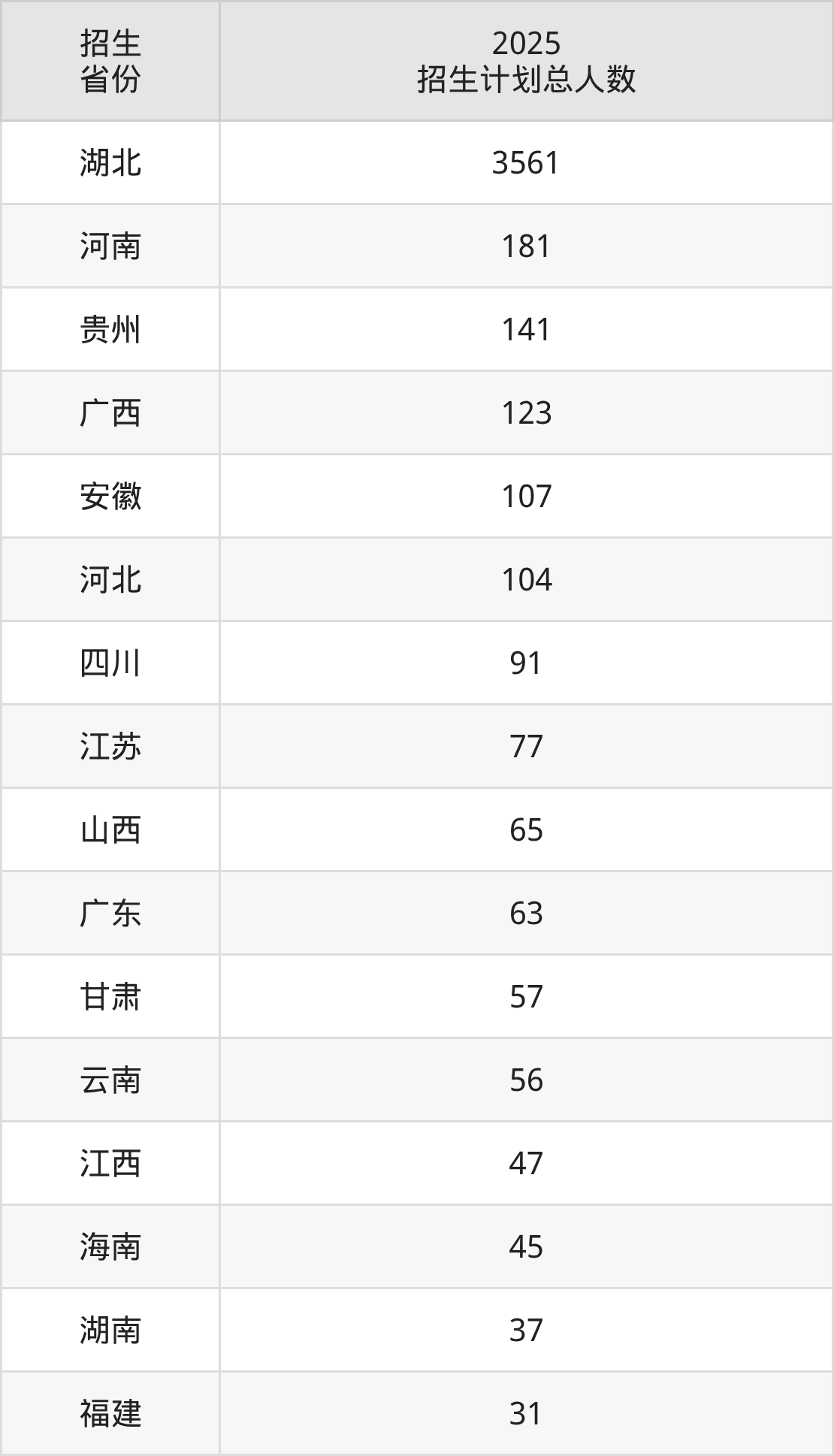 2025年武汉纺织大学面向全国25个省市开展本科招生;招生专业共37个,招生人数共4859人。2025年在湖北省招生计划总人数是3561人,其中,武汉纺织大学在湖北省招生人数最多的是计算机类。武汉纺织大学在各省具体招生人数情况如下表。