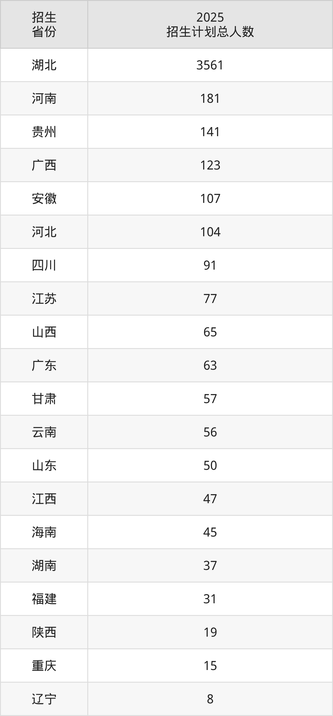 2025年武汉纺织大学面向全国26个省市开展本科招生;招生专业共37个,招生人数共4909人。2025年在湖北省招生计划总人数是3561人,其中,武汉纺织大学在湖北省招生人数最多的是计算机类。武汉纺织大学在各省具体招生人数情况如下表。