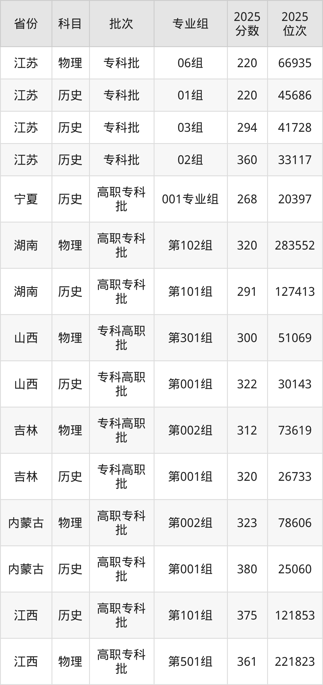 2025年在专科历史类进行招生,各专业组分数线详情如下: