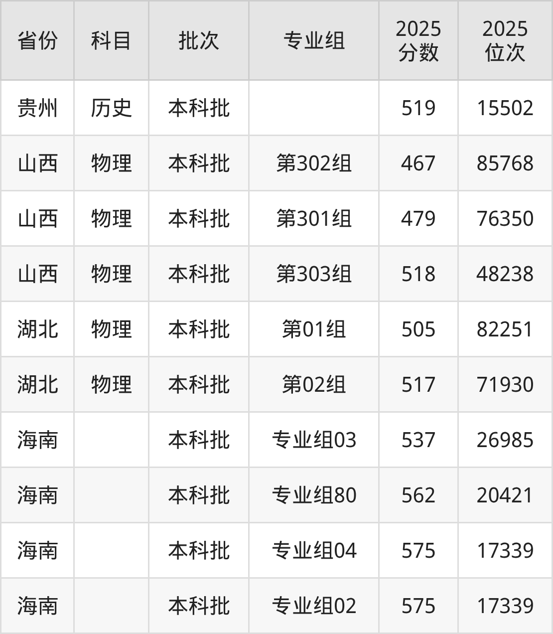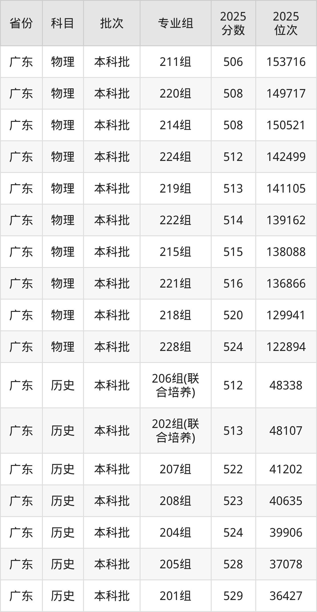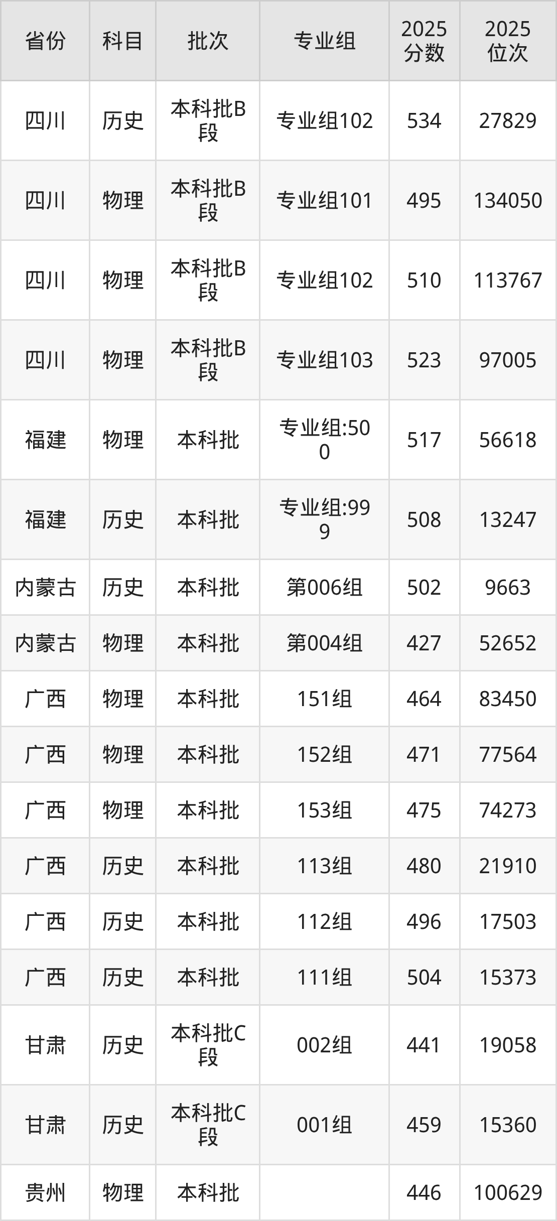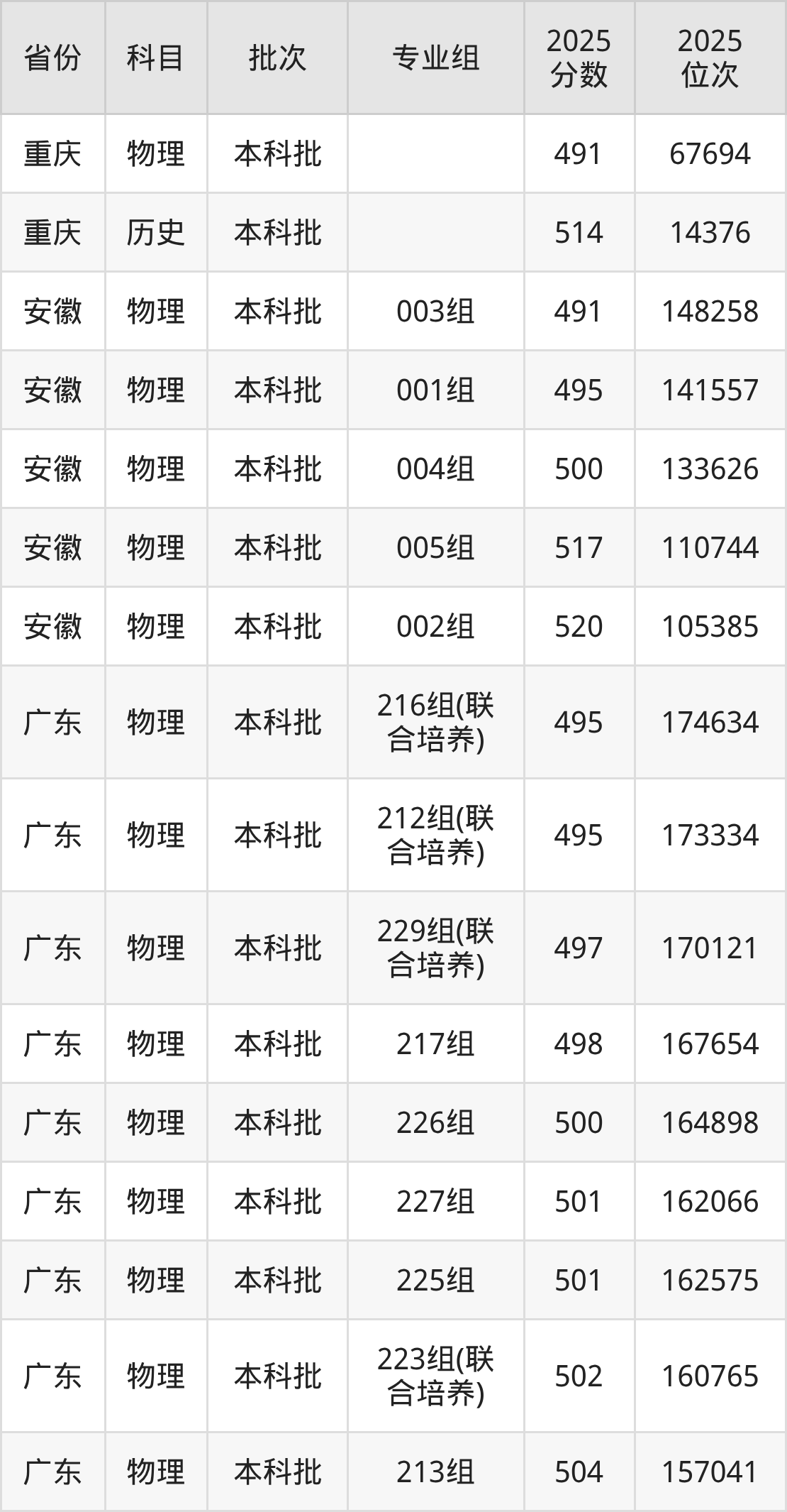 2025年在本科物理类进行招生,各专业组分数线详情如下: