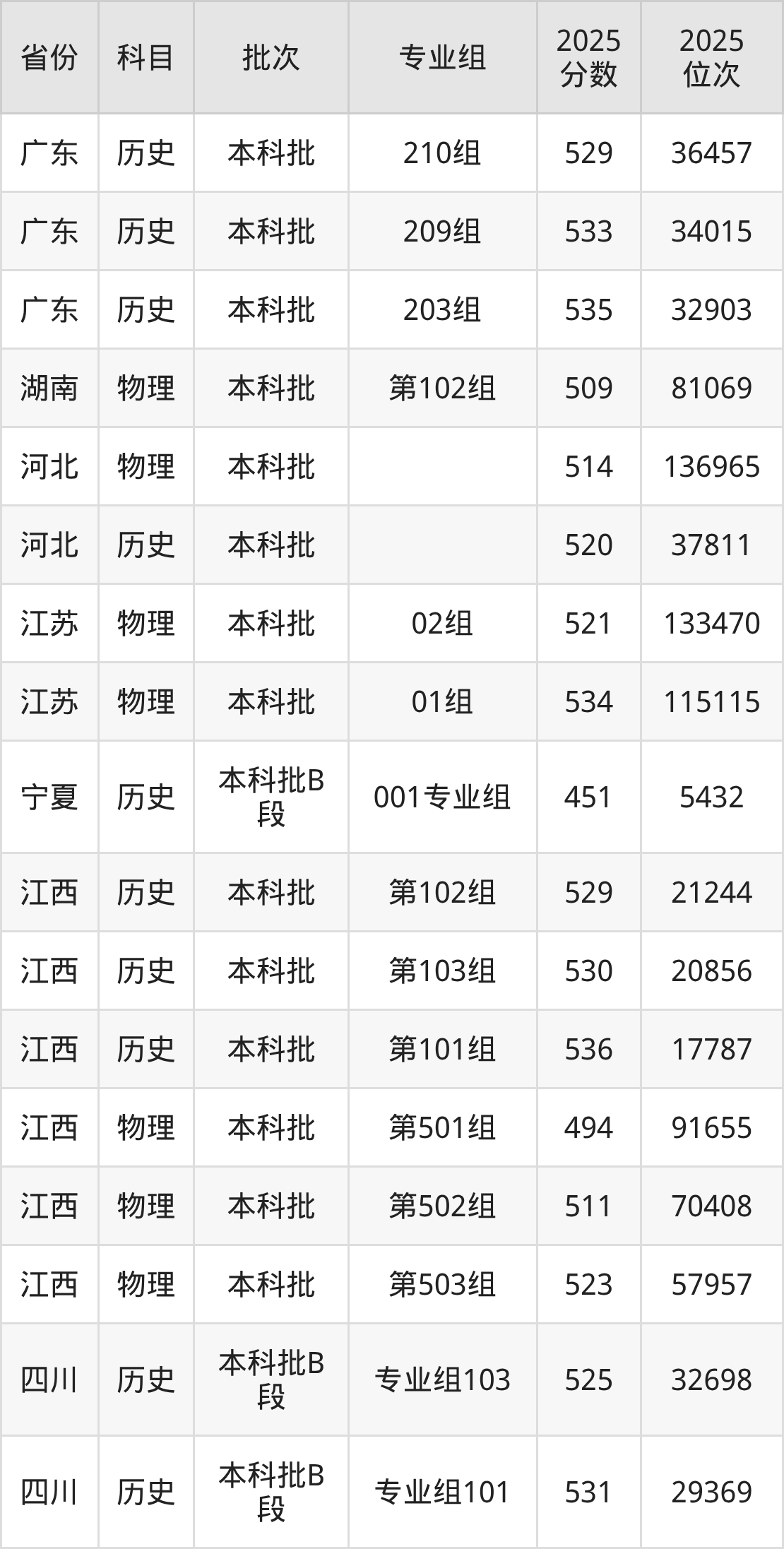 2025年在本科历史类进行招生,各专业组分数线详情如下: