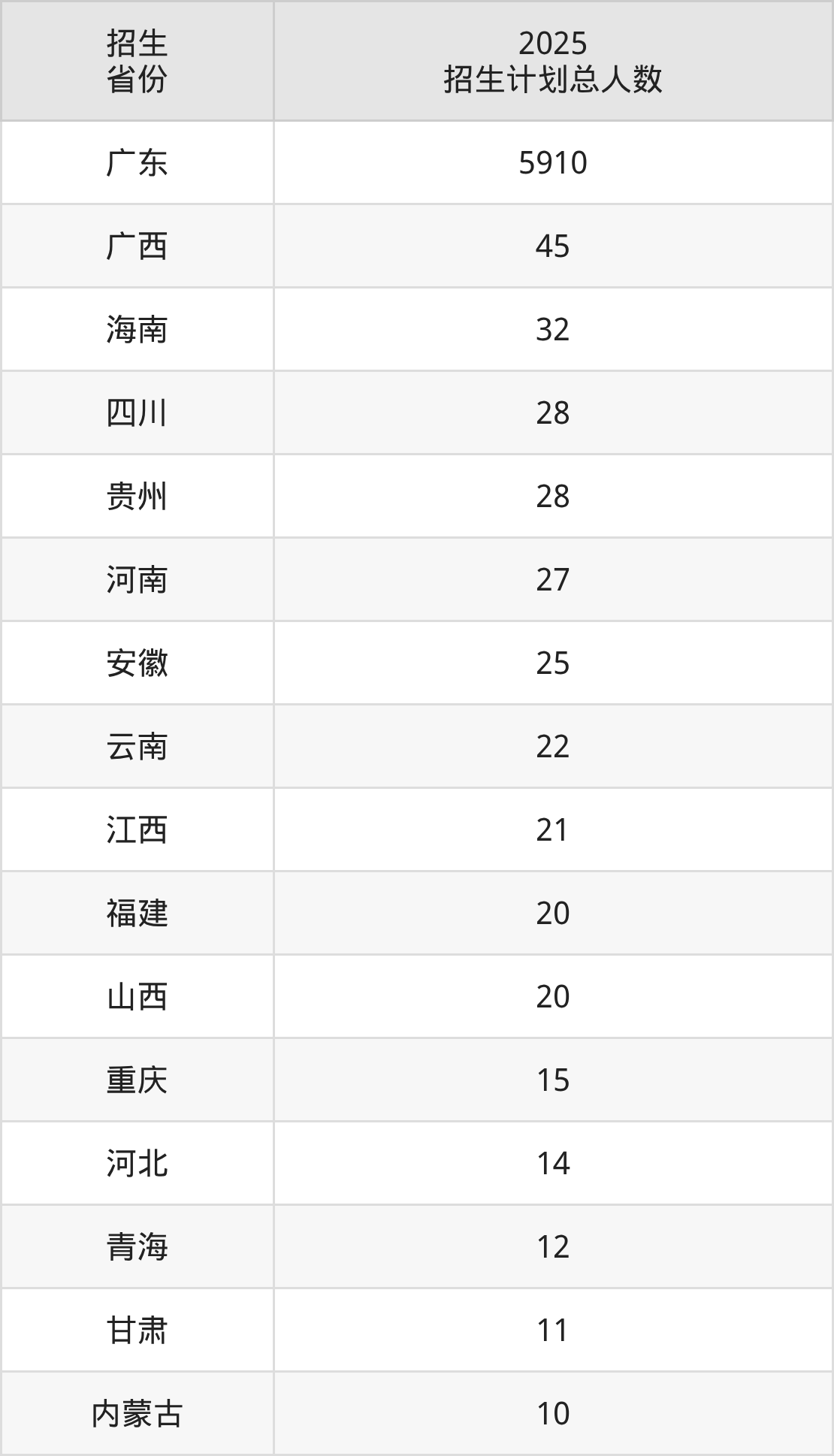 2025年肇庆学院面向全国20个省市开展本科招生;招生专业共46个,招生人数共6264人。2025年在广东省招生计划总人数是5910人,其中,肇庆学院在广东省招生人数最多的是汉语言文学。肇庆学院在各省具体招生人数情况如下表。