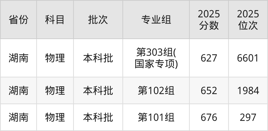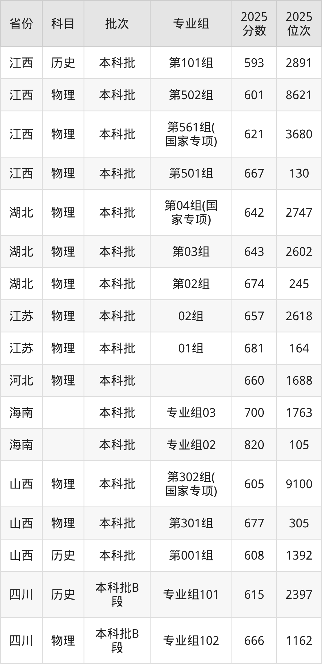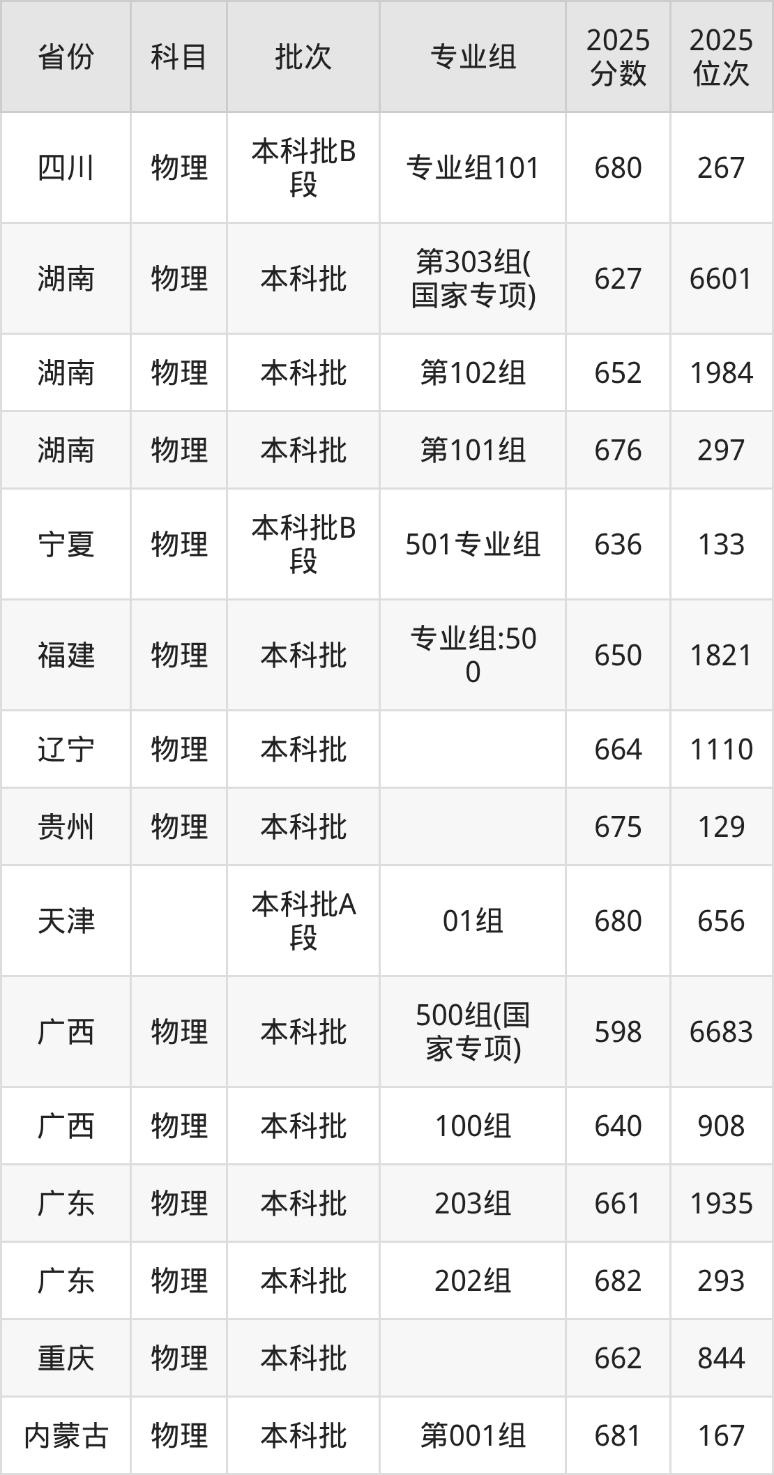 2025年在本科物理类进行招生,各专业组分数线详情如下: