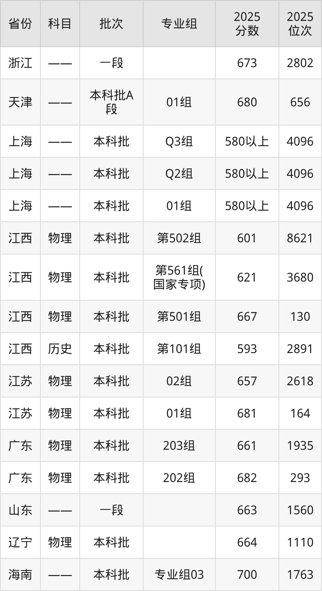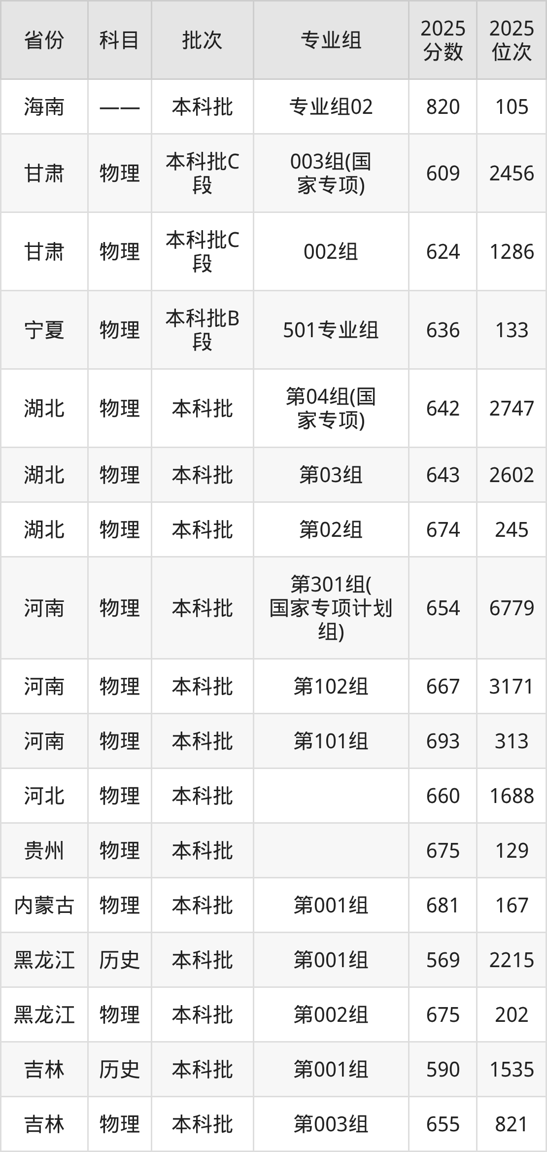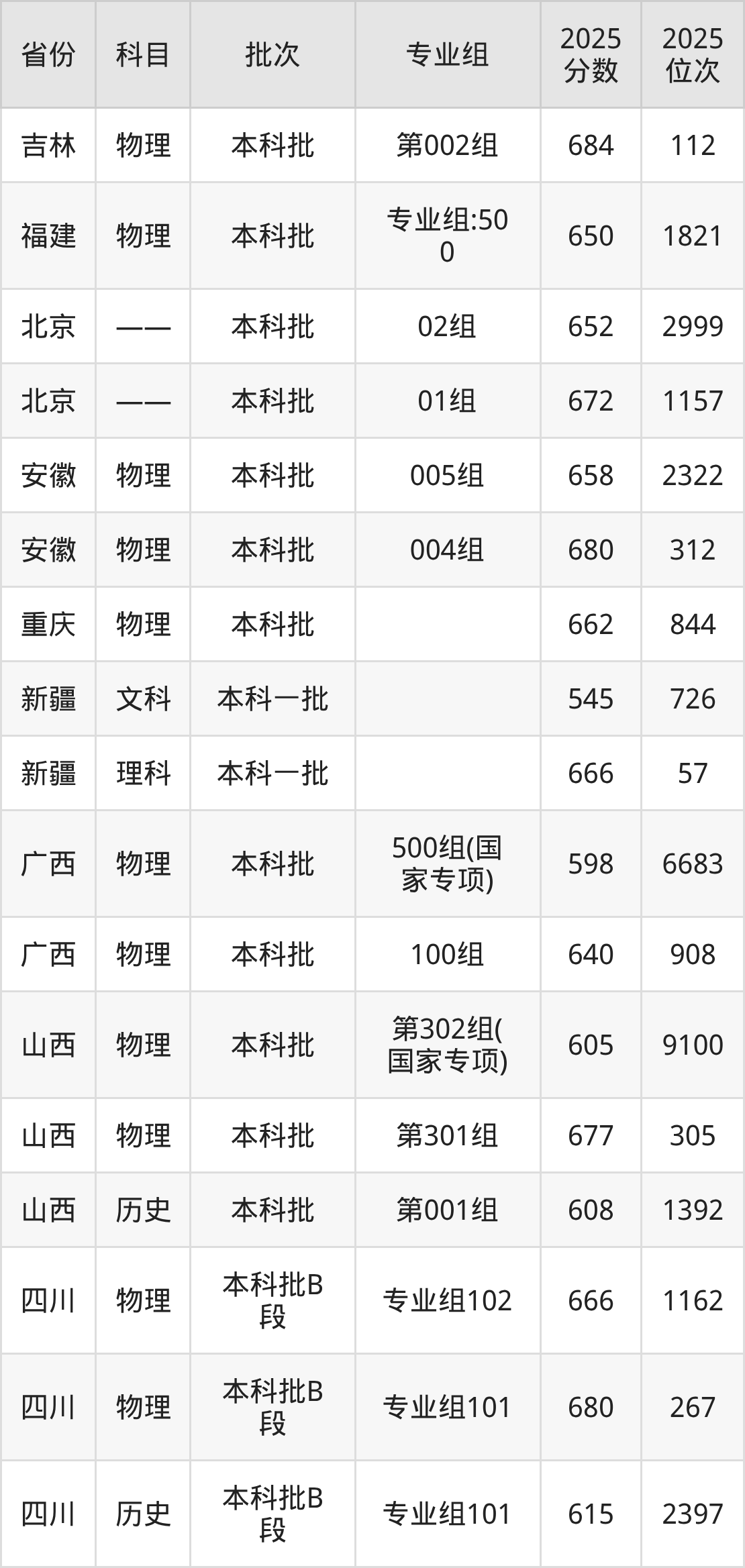 2025年在本科物理类进行招生,各专业组分数线详情如下: