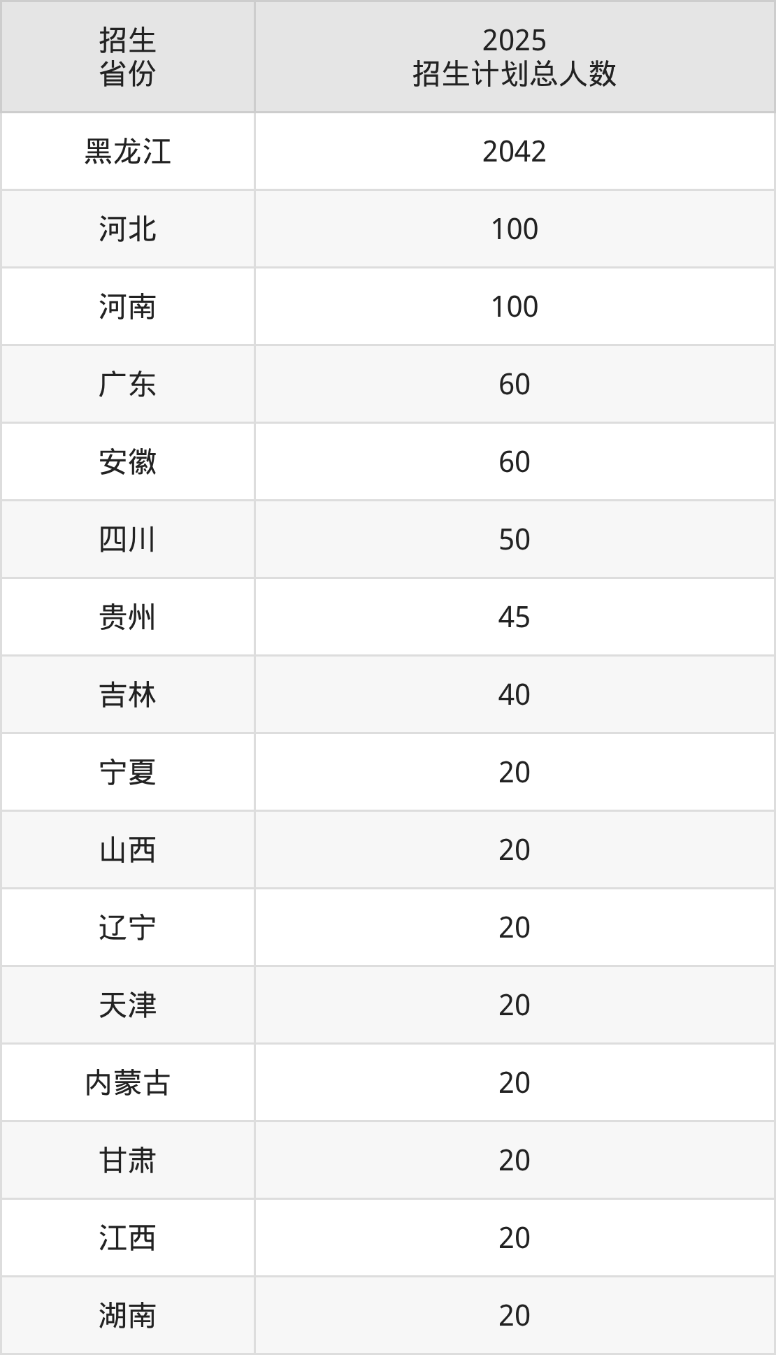2025年黑龙江职业学院面向全国18个省市开展专科招生;招生专业共49个,招生人数共2687人。2025年在黑龙江省招生计划总人数是2042人,其中,黑龙江职业学院在黑龙江省招生人数最多的是动物医学。黑龙江职业学院在各省具体招生人数情况如下表。