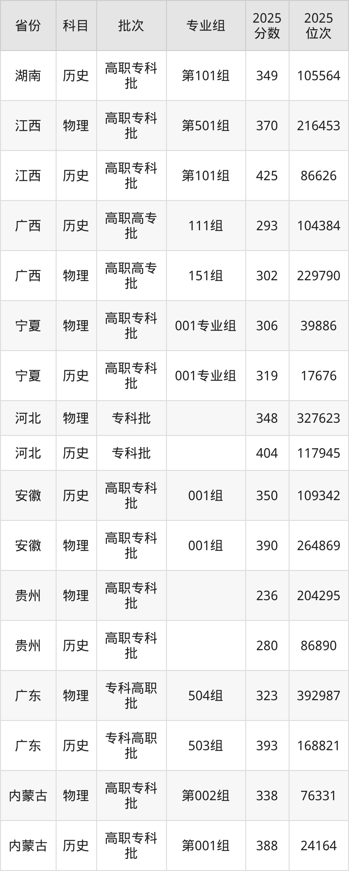2025年黑龙江职业学院全国录取分数线是236分到425分,录取最低在贵州物理类、录取最高在江西历史类(第101组)。各省各专业组最低分具有差异,详情如下: