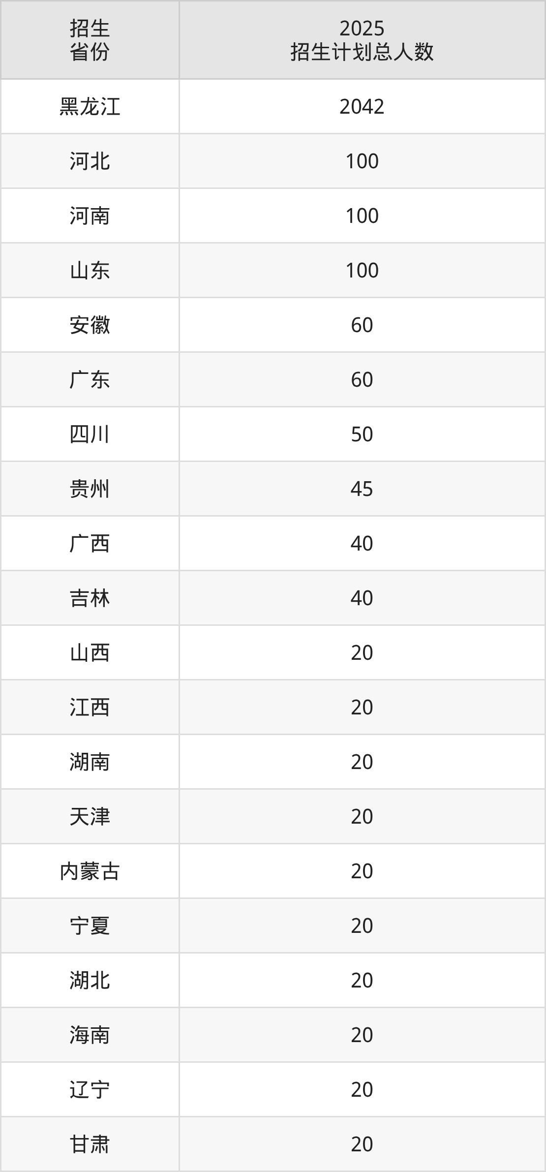 2025年黑龙江职业学院面向全国21个省市开展专科招生;招生专业共49个,招生人数共2847人。2025年在黑龙江省招生计划总人数是2042人,其中,黑龙江职业学院在黑龙江省招生人数最多的是动物医学。黑龙江职业学院在各省具体招生人数情况如下表。