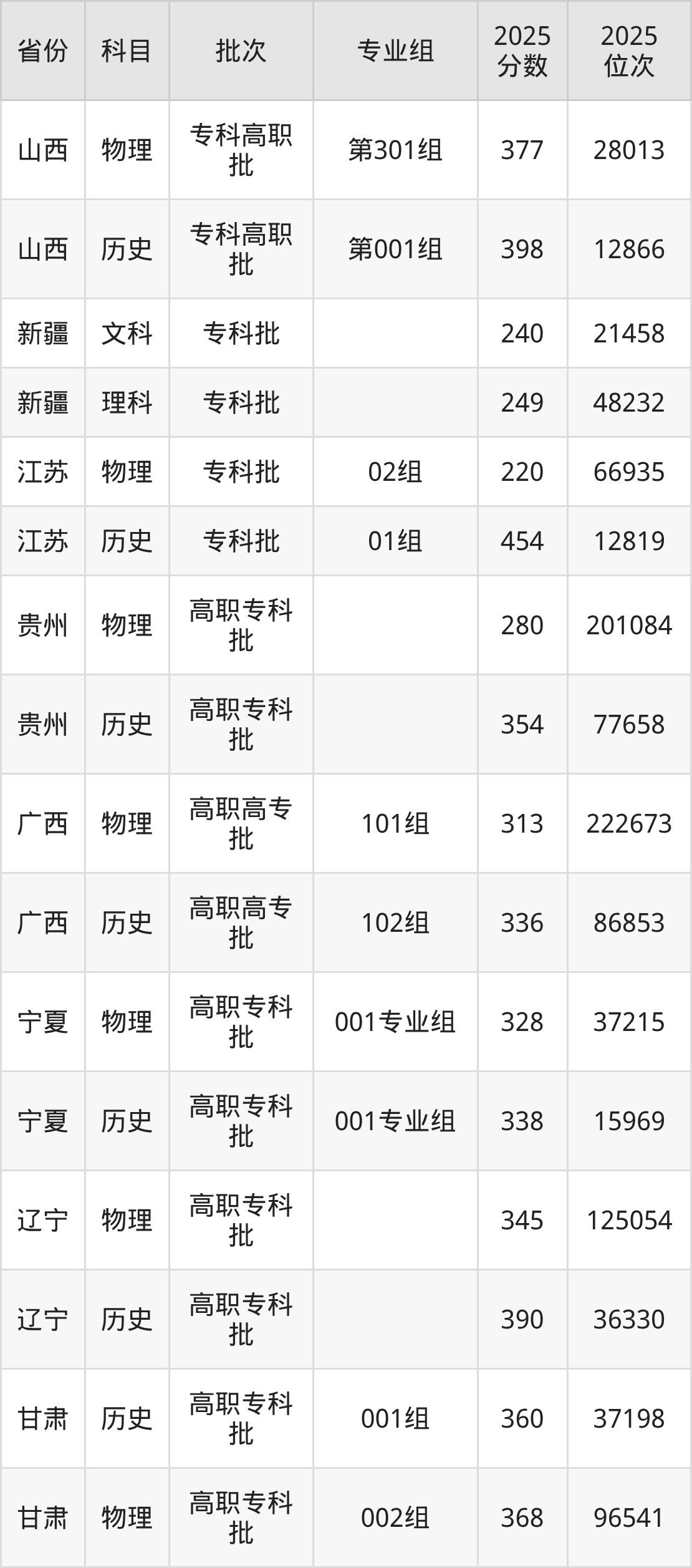 普通类专科物理类最低377分,专科历史类最低398分