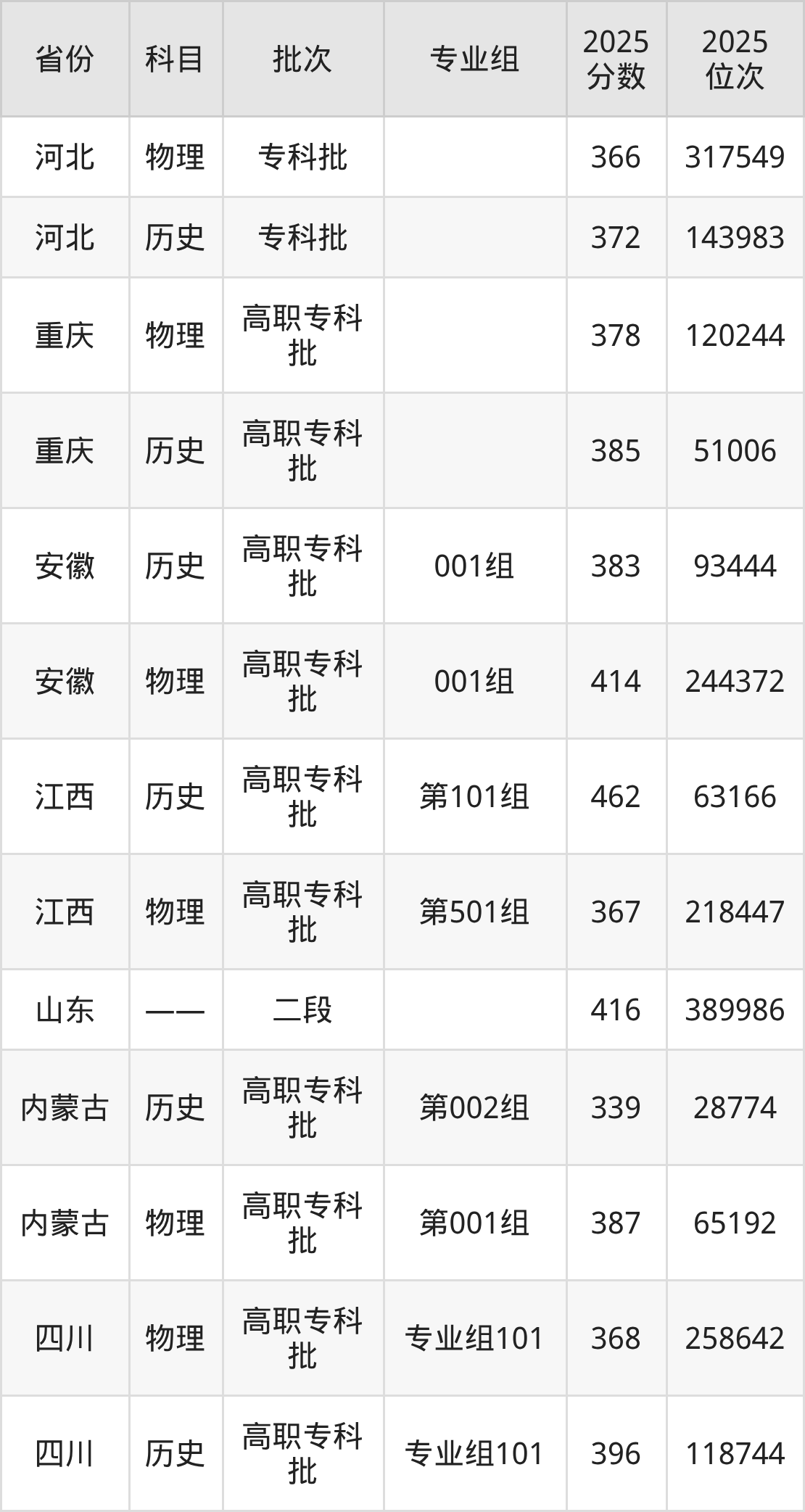 普通类专科物理类最低366分,专科历史类最低372分