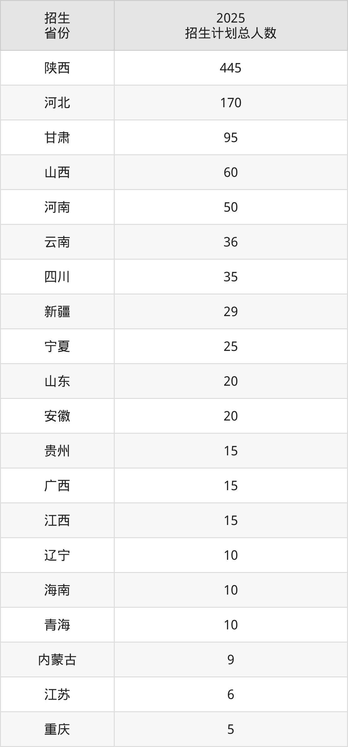 2025年西安职业技术学院面向全国20个省市开展专科招生;招生专业共41个,招生人数共1080人。2025年在陕西省招生计划总人数是445人,其中,西安职业技术学院在陕西省招生人数最多的是护理。西安职业技术学院在各省具体招生人数情况如下表。