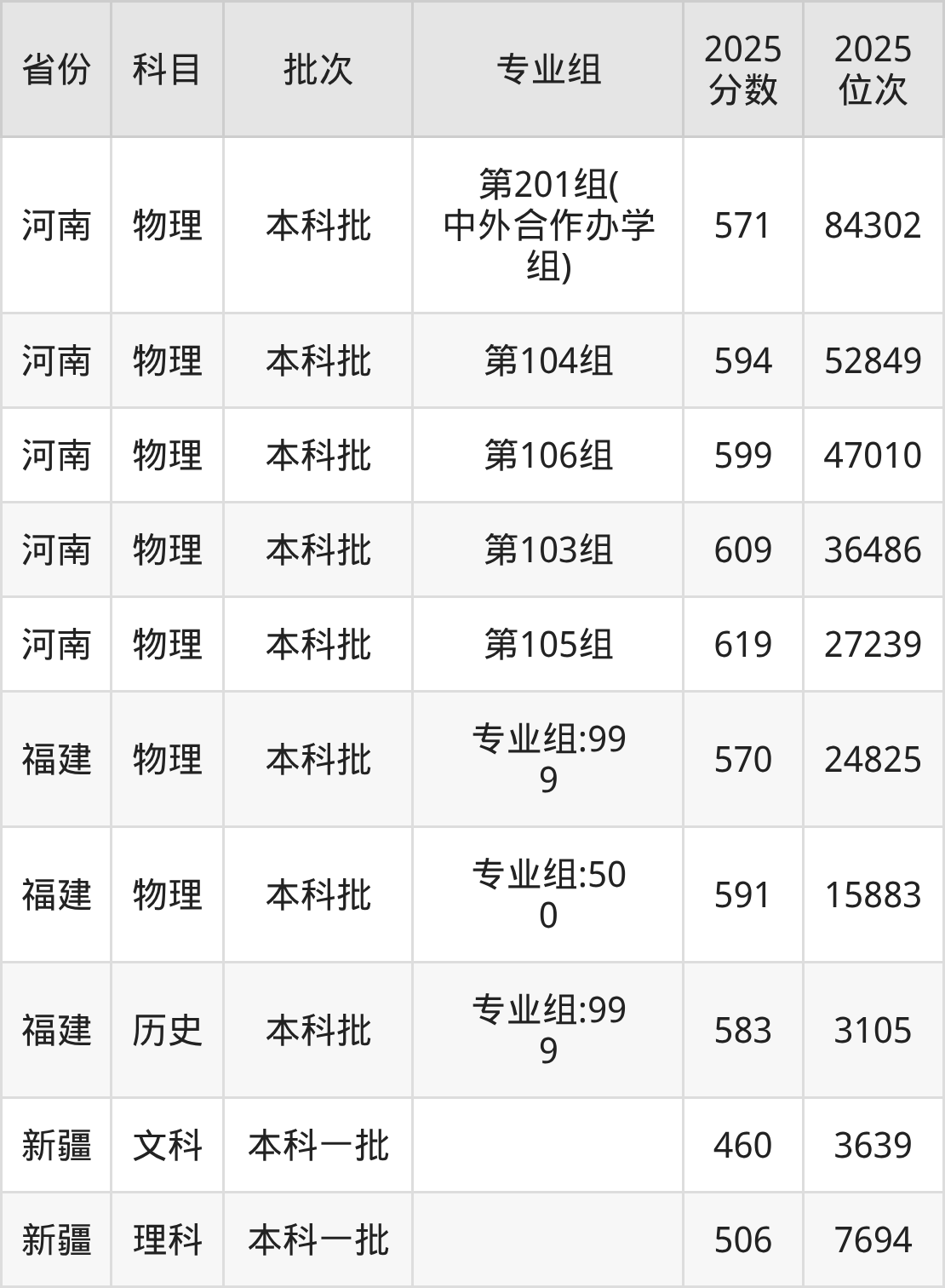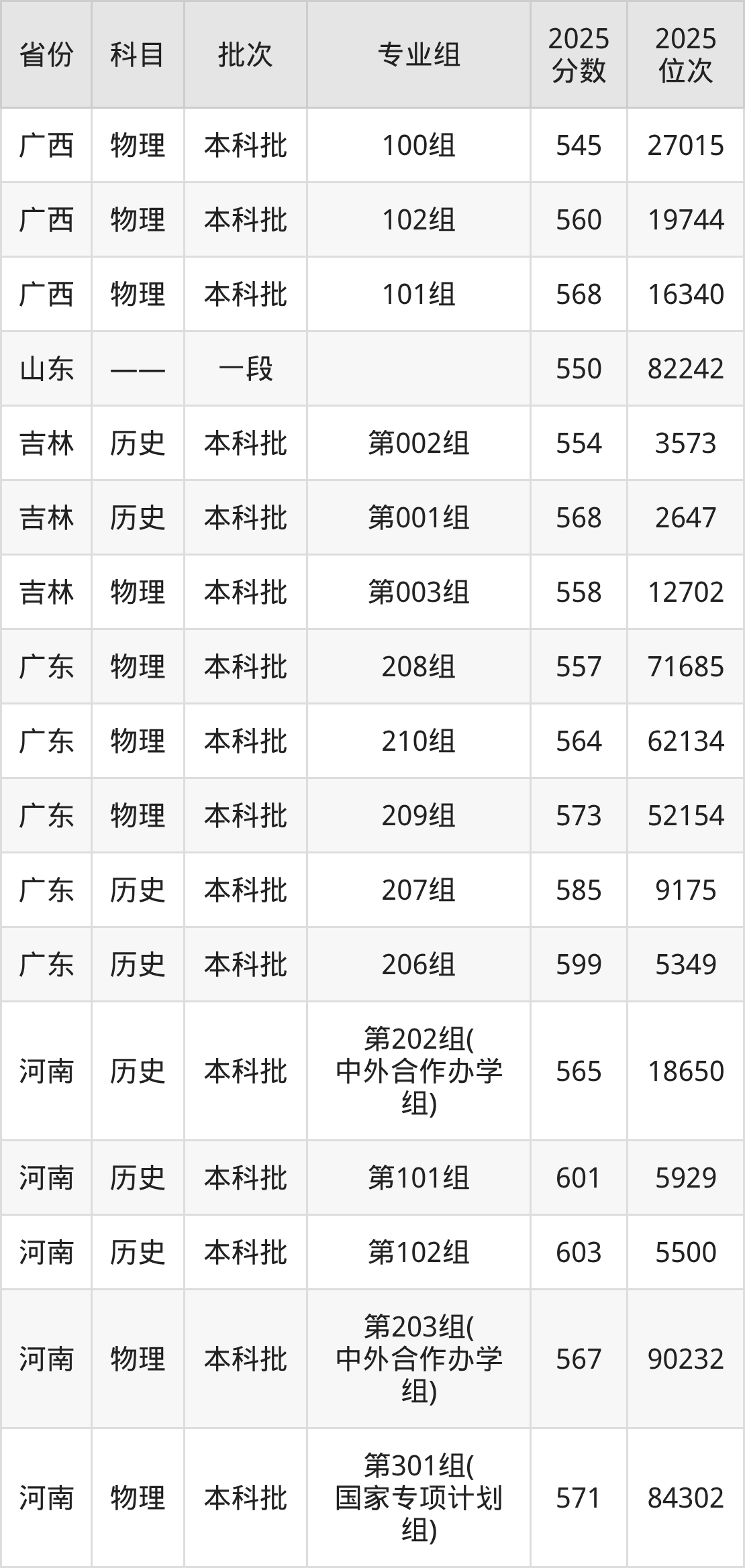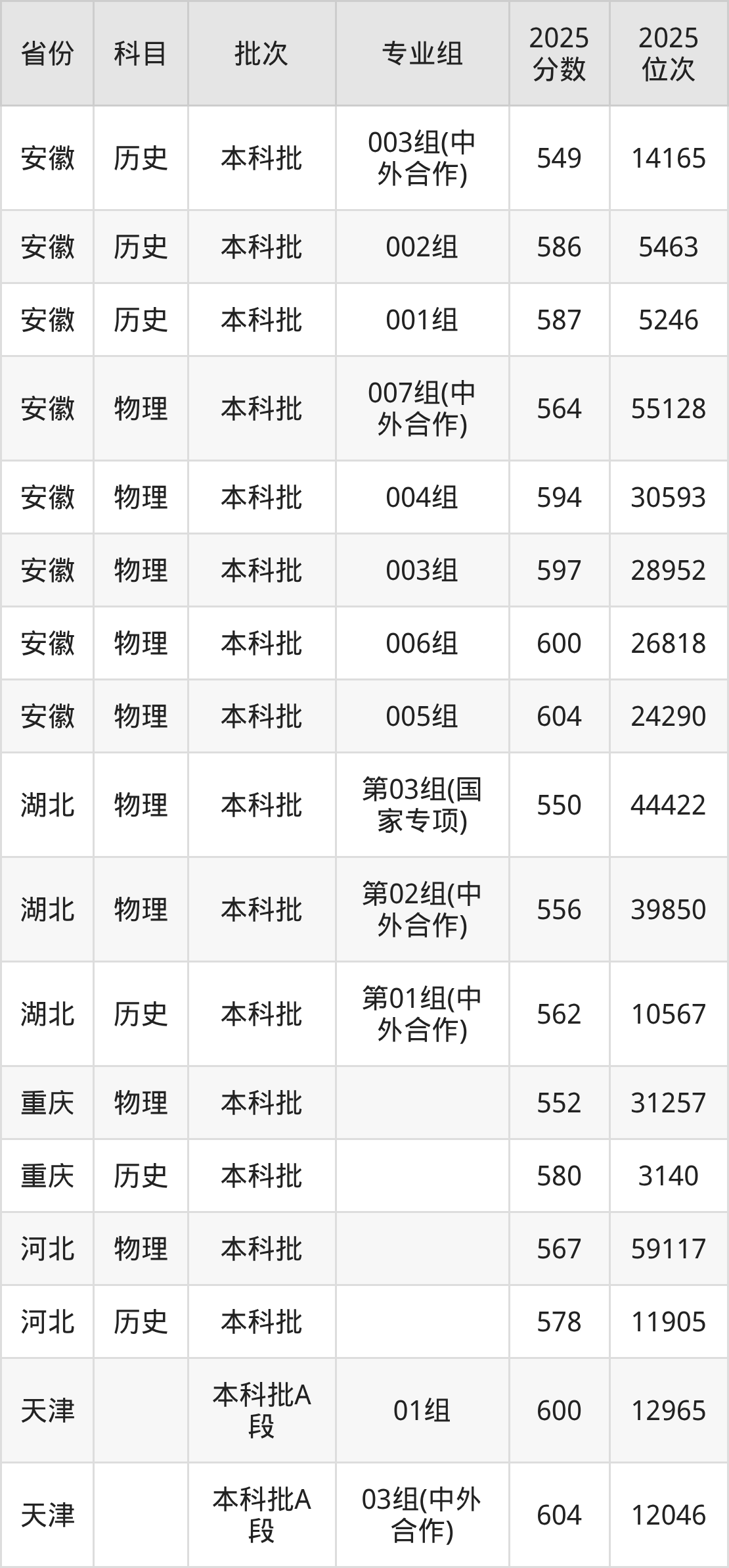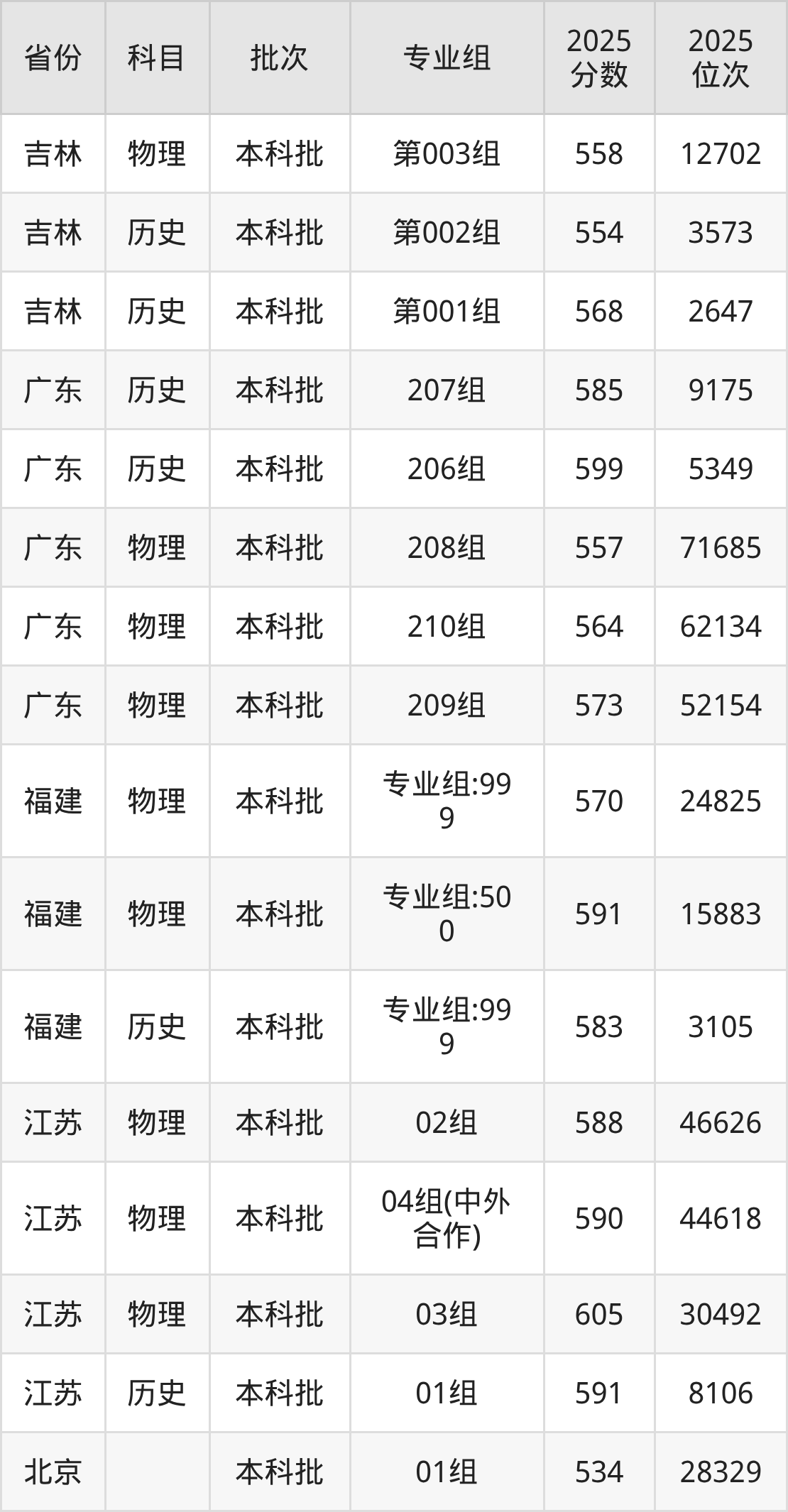 2025年在本科物理类进行招生,各专业组分数线详情如下: