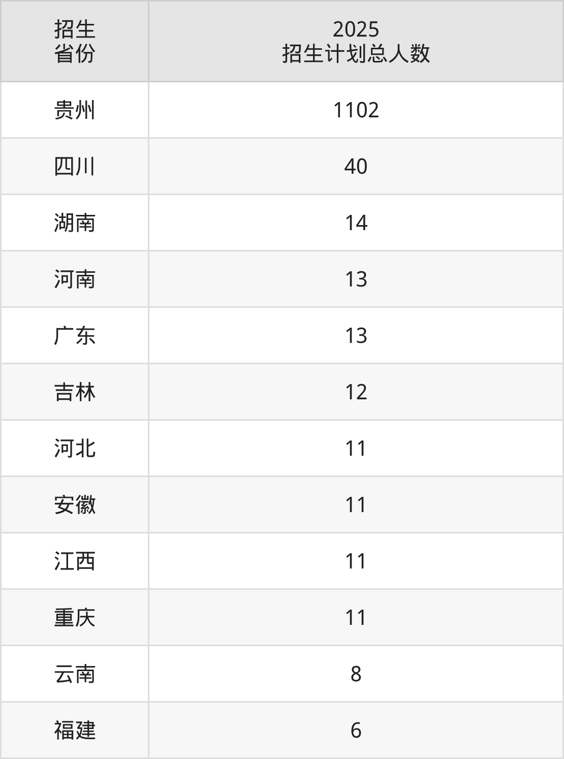 2025年贵州机电职业技术学院面向全国12个省市开展专科招生;招生专业共23个,招生人数共1252人。2025年在贵州省招生计划总人数是1102人,其中,贵州机电职业技术学院在贵州省招生人数最多的是机电一体化技术。贵州机电职业技术学院在各省具体招生人数情况如下表。