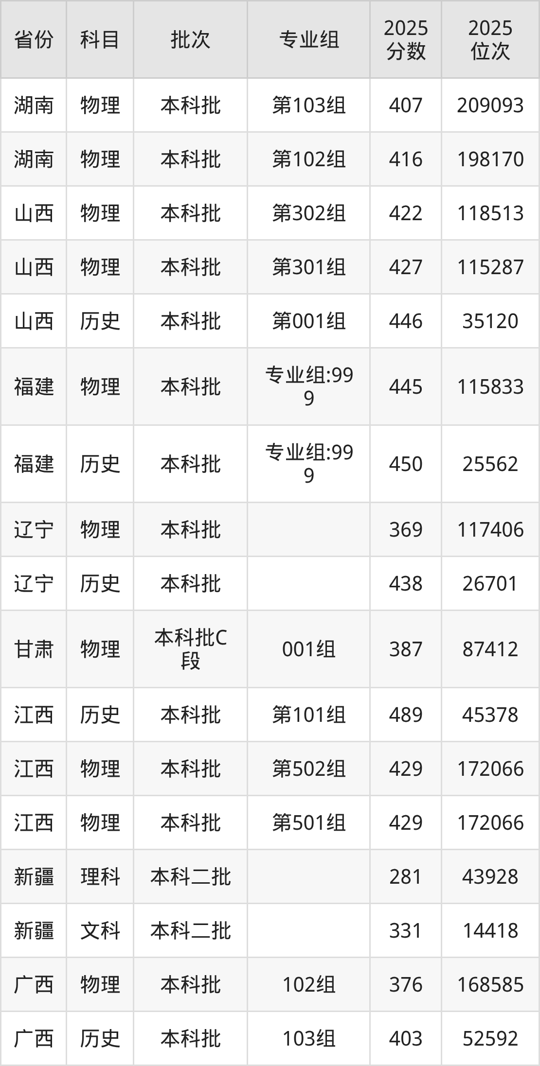 2025年投档录取最低分为425分,录取最低位次为103219名。