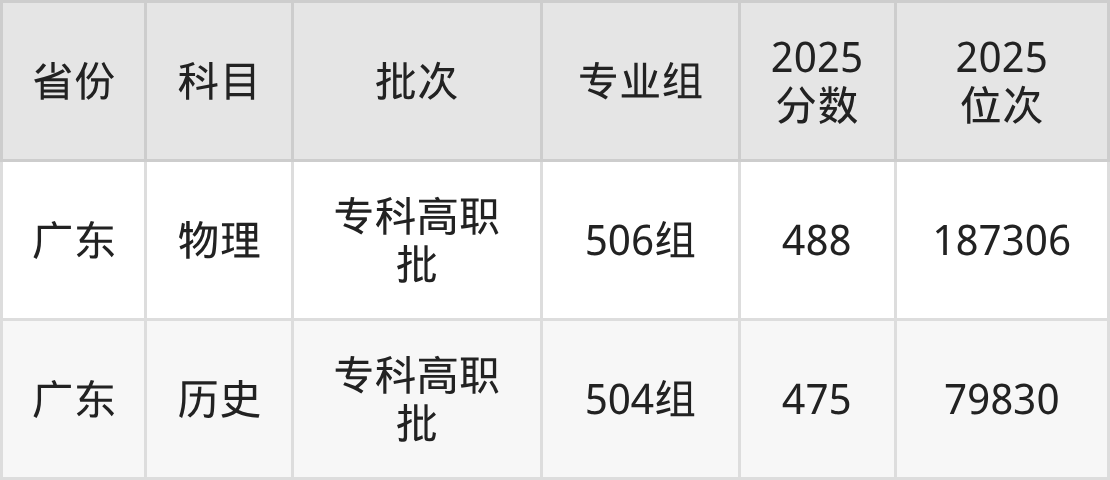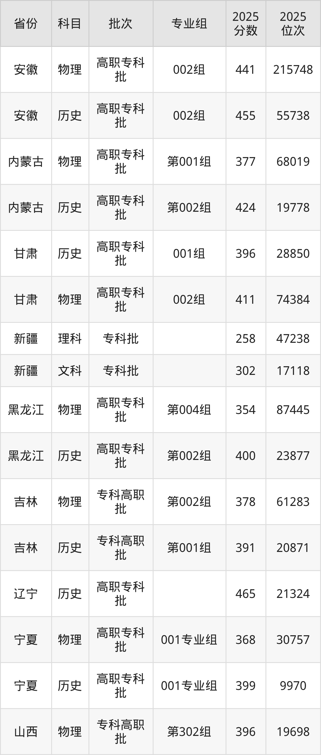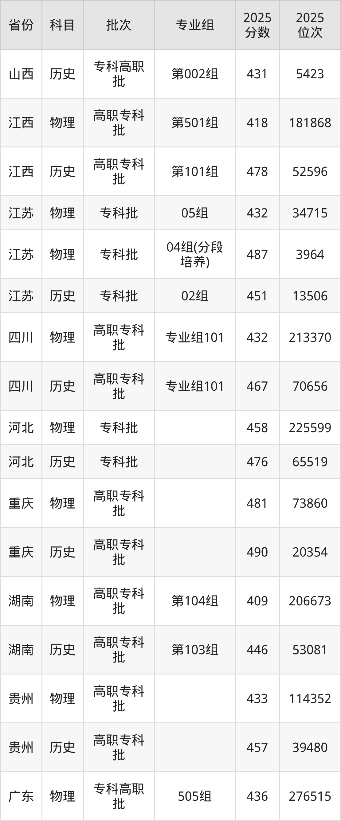 2025年在专科历史类进行招生,各专业组分数线详情如下:
