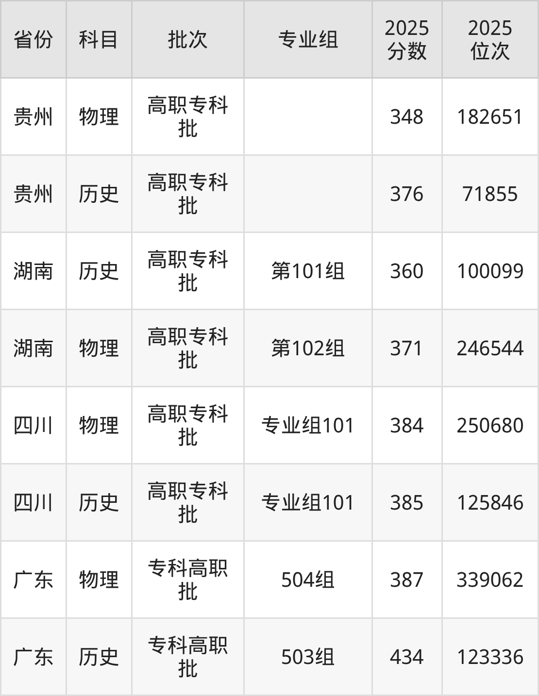 2025年广西交通职业技术学院全国录取分数线是348分到434分,录取最低在贵州物理类、录取最高在广东历史类(503组)。各省各专业组最低分具有差异,详情如下: