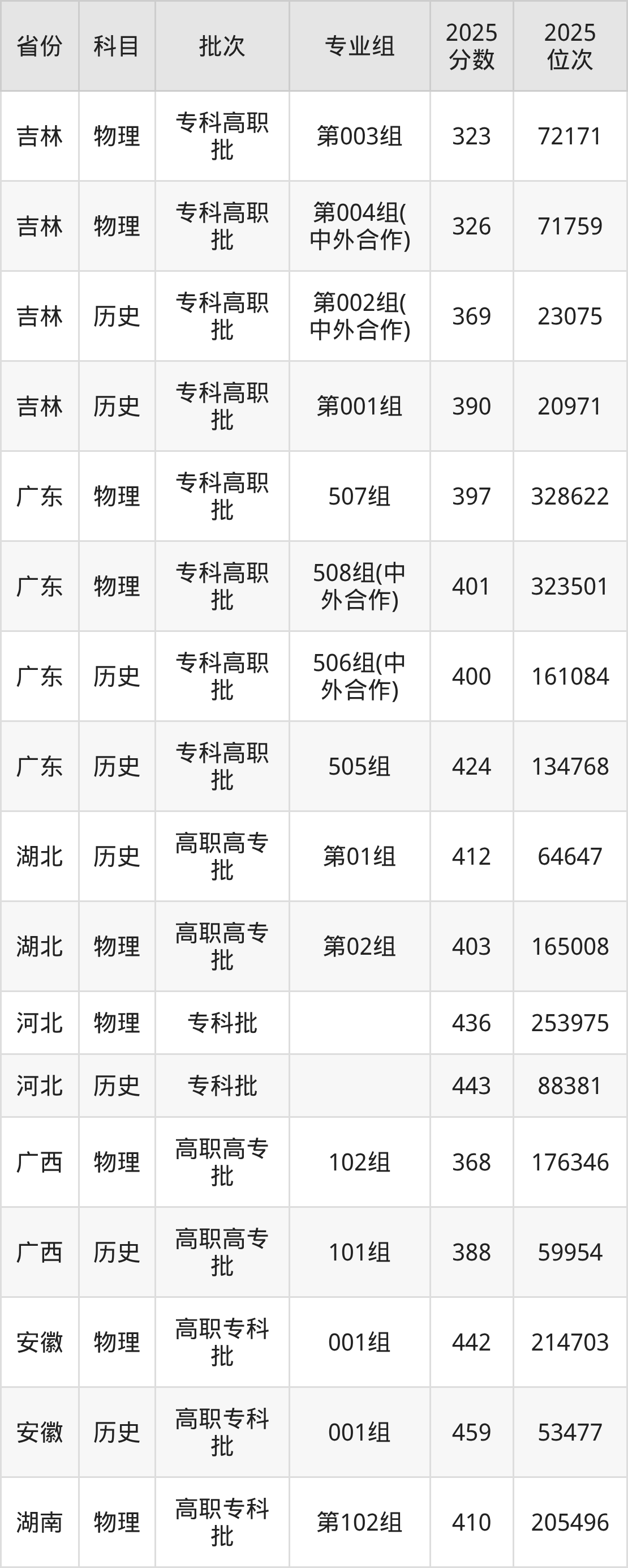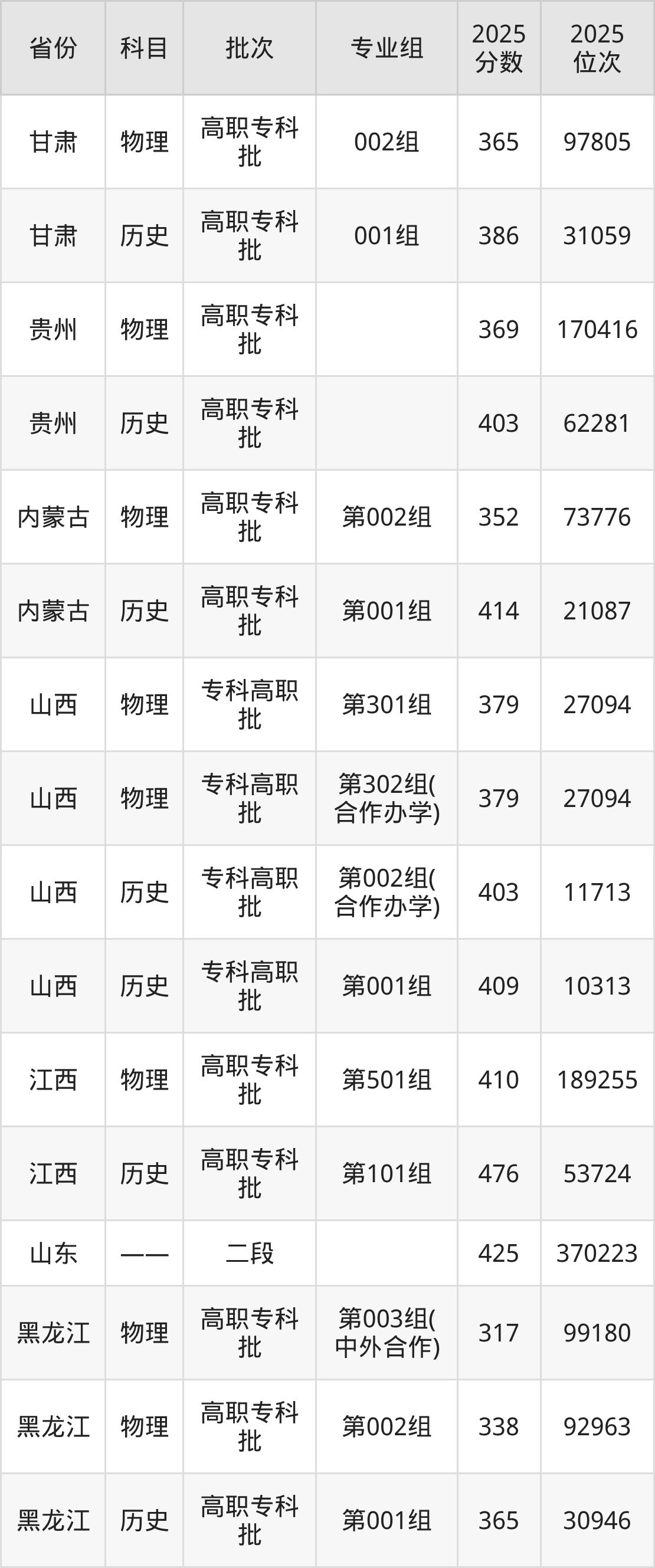 2025年重庆财经职业学院全国录取分数线是317分到476分,录取最低在黑龙江物理类(第003组(中外合作))、录取最高在江西历史类(第101组)。各省各专业组最低分具有差异,详情如下: