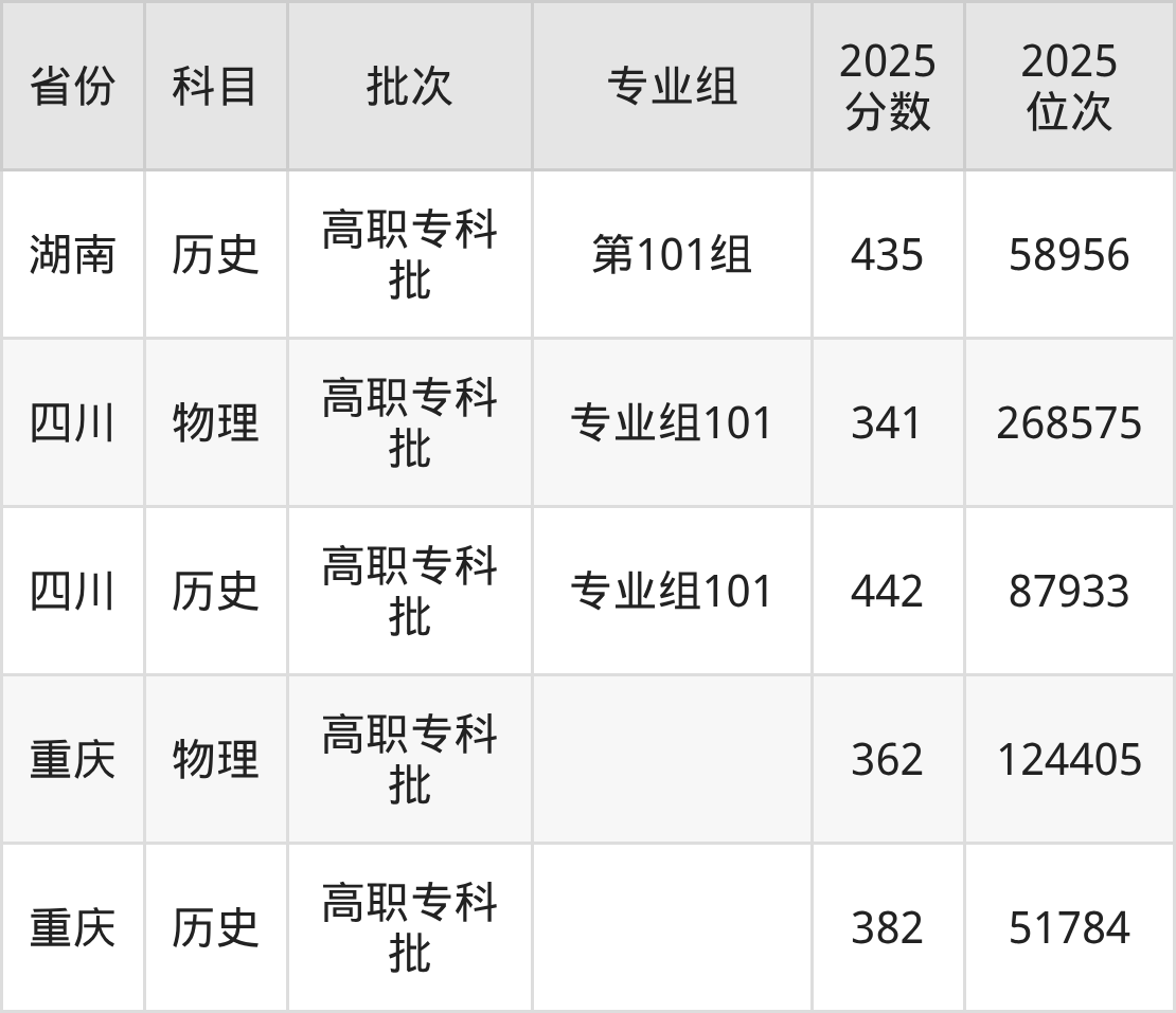 重庆财经职业学院专业组101:2025年投档录取最低分为341分,录取最低位次为268575名。