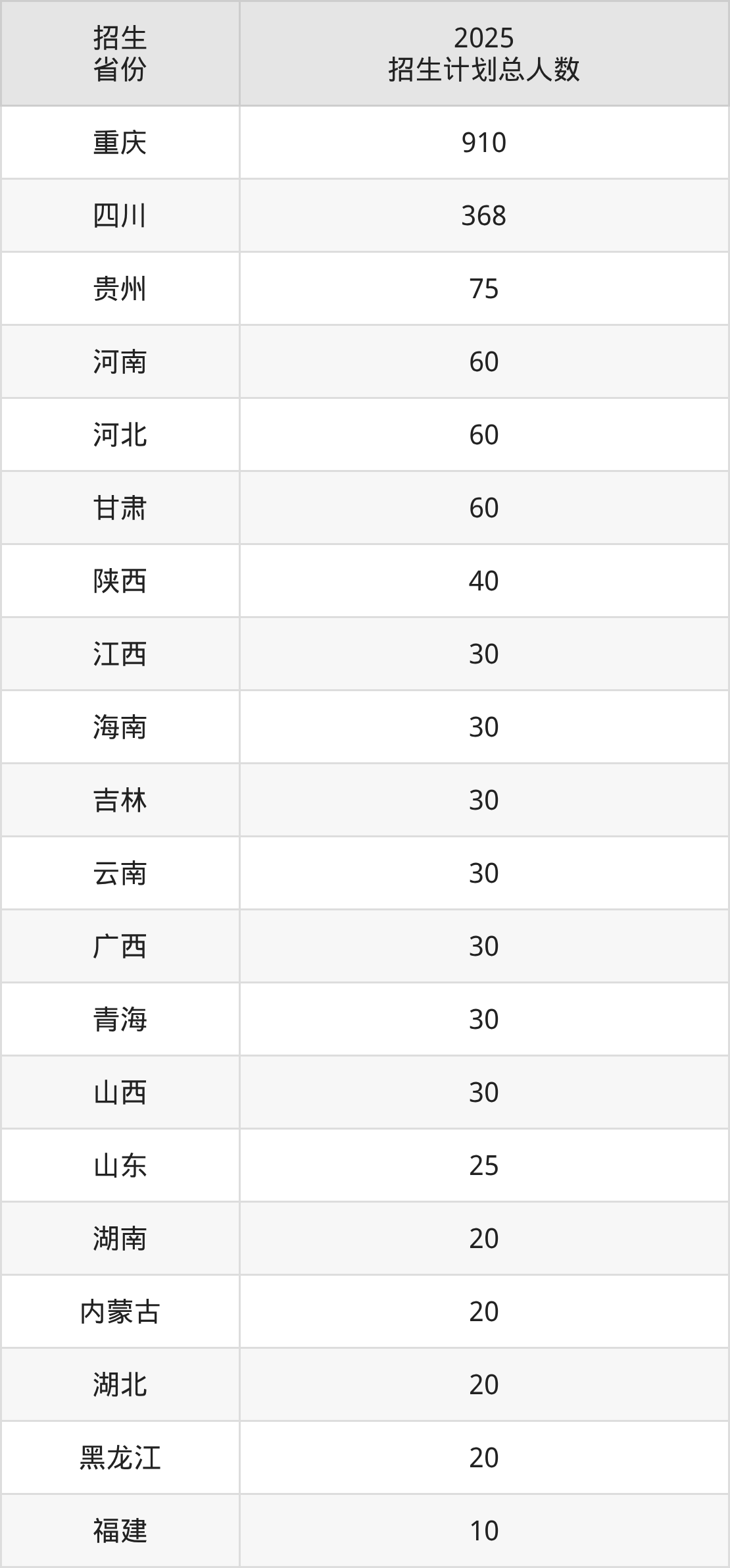 2025年重庆财经职业学院面向全国22个省市开展专科招生;招生专业共36个,招生人数共1918人。2025年在重庆市招生计划总人数是910人,其中,重庆财经职业学院在重庆市招生人数最多的是财务会计类。重庆财经职业学院在各省具体招生人数情况如下表。