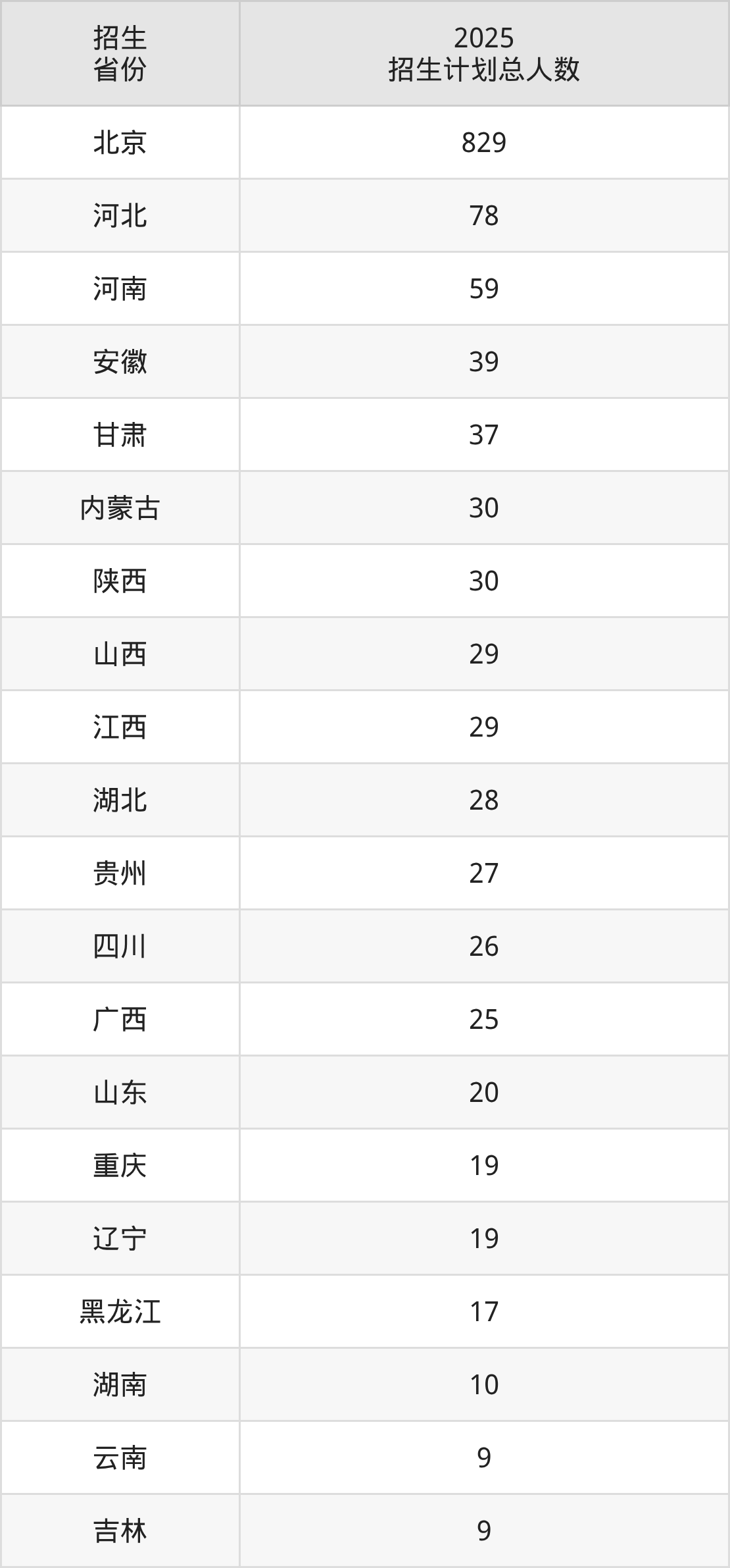 2025年北京印刷学院面向全国29个省市开展本科招生;招生专业共22个,招生人数共1420人。2025年在北京市招生计划总人数是829人,其中,北京印刷学院在北京市招生人数最多的是编辑出版学。北京印刷学院在各省具体招生人数情况如下表。