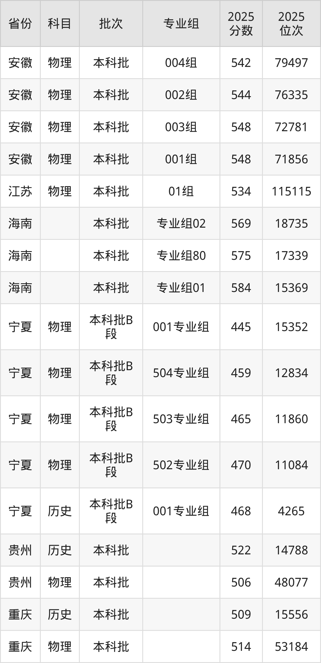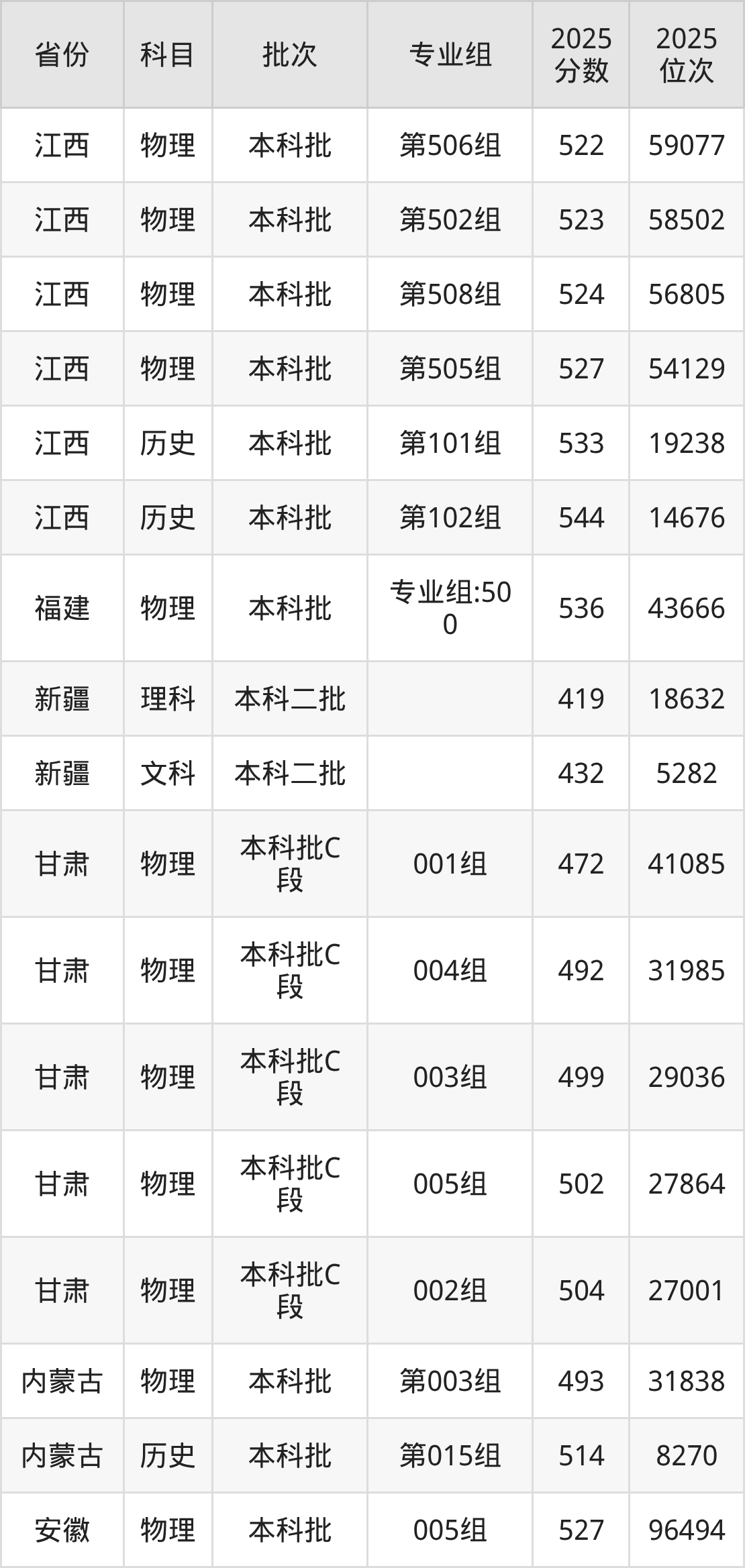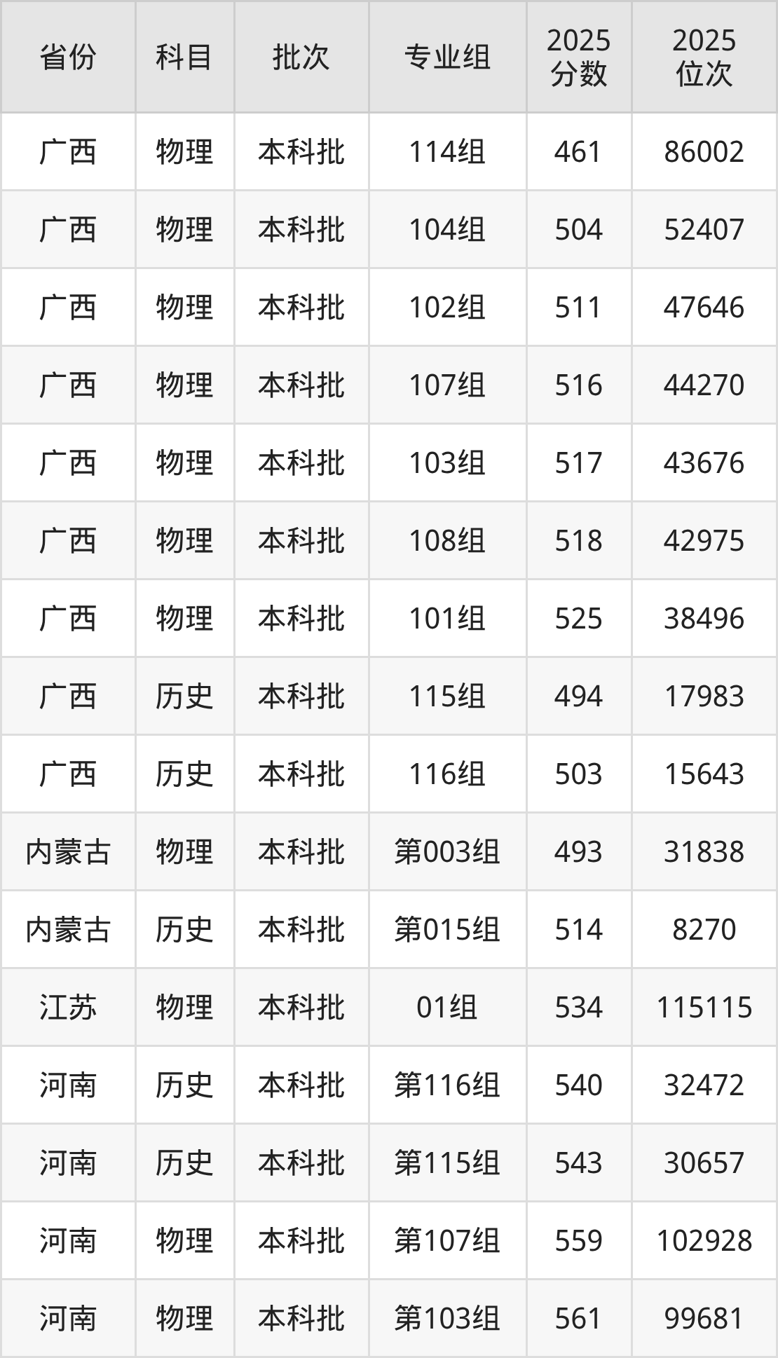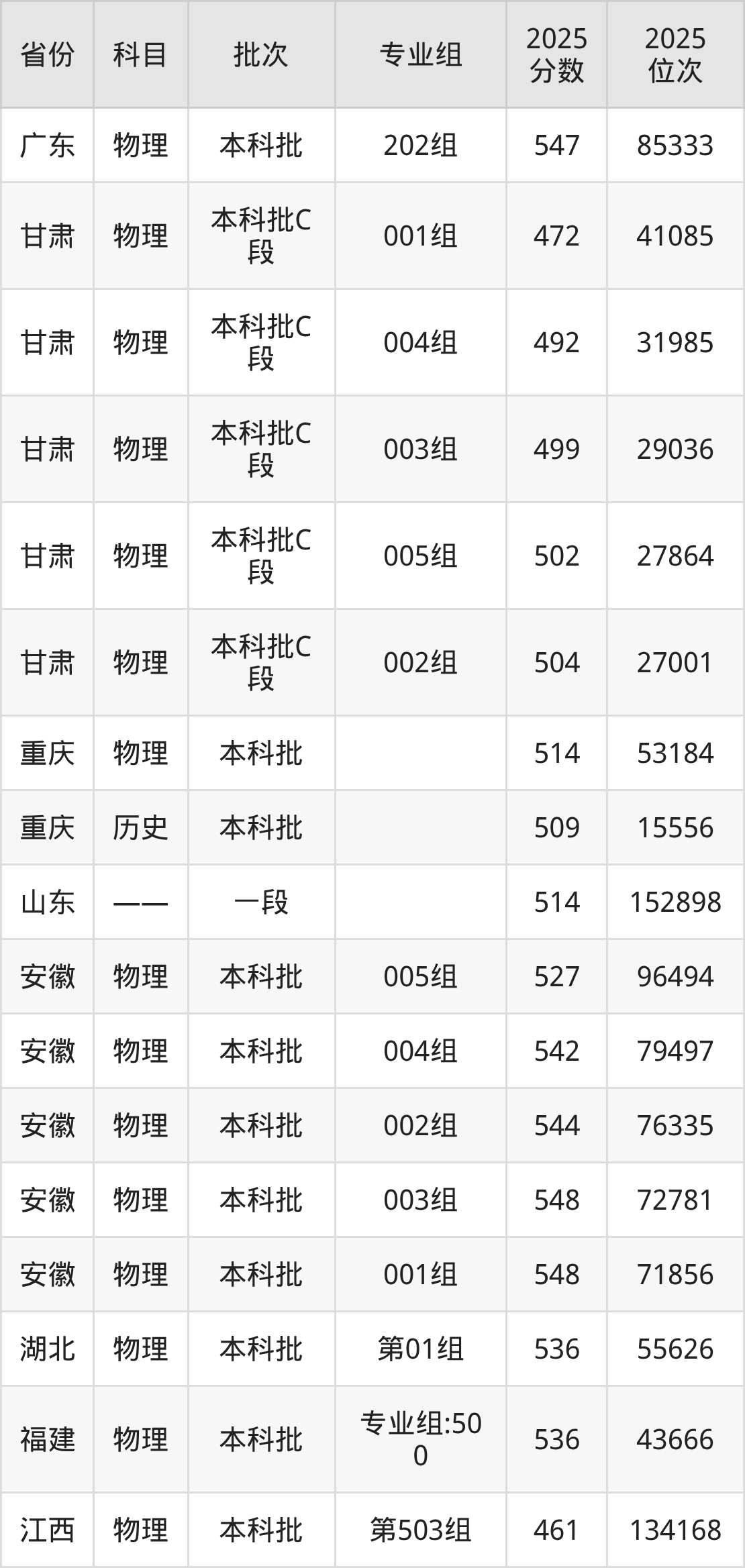2025年在本科物理类进行招生,各专业组分数线详情如下: