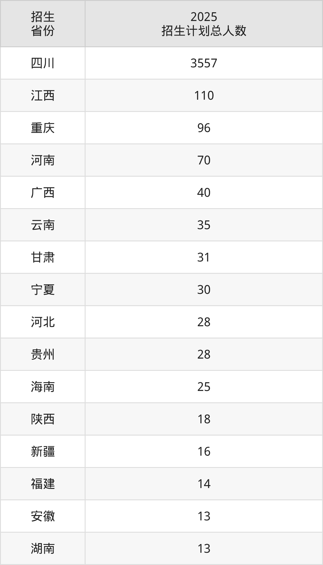 2025年成都工业学院面向全国22个省市开展本科招生;招生专业共40个,招生人数共4171人。2025年在四川省招生计划总人数是3557人,其中,成都工业学院在四川省招生人数最多的是软件工程。成都工业学院在各省具体招生人数情况如下表。