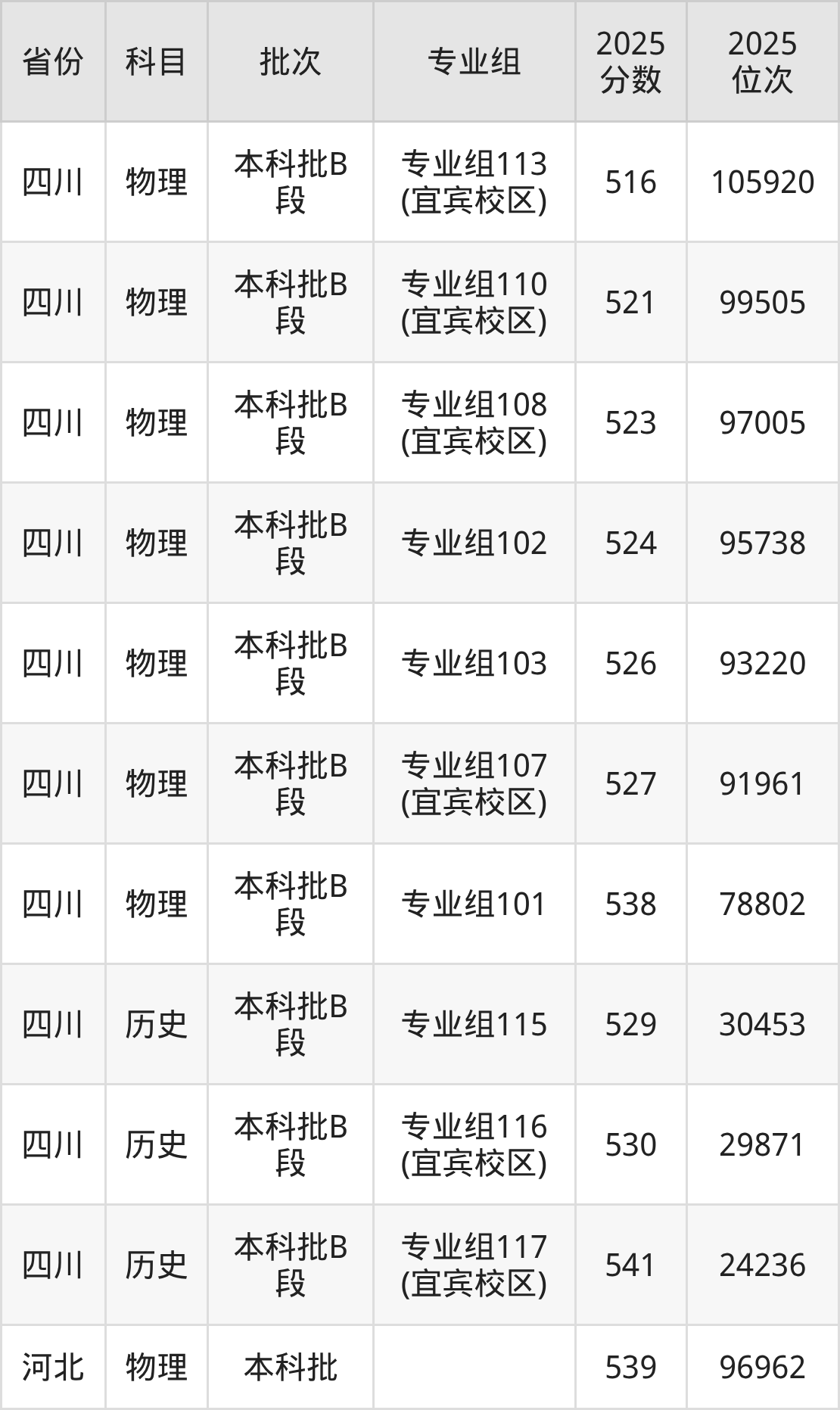 成都工业学院专业组114(宜宾校区):2025年投档录取最低分为515分,录取最低位次为107235名。
