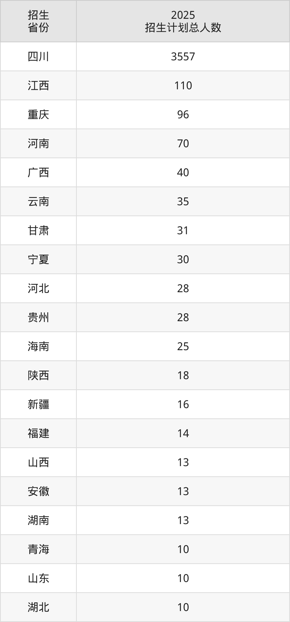 2025年成都工业学院面向全国23个省市开展本科招生;招生专业共40个,招生人数共4181人。2025年在四川省招生计划总人数是3557人,其中,成都工业学院在四川省招生人数最多的是软件工程。成都工业学院在各省具体招生人数情况如下表。