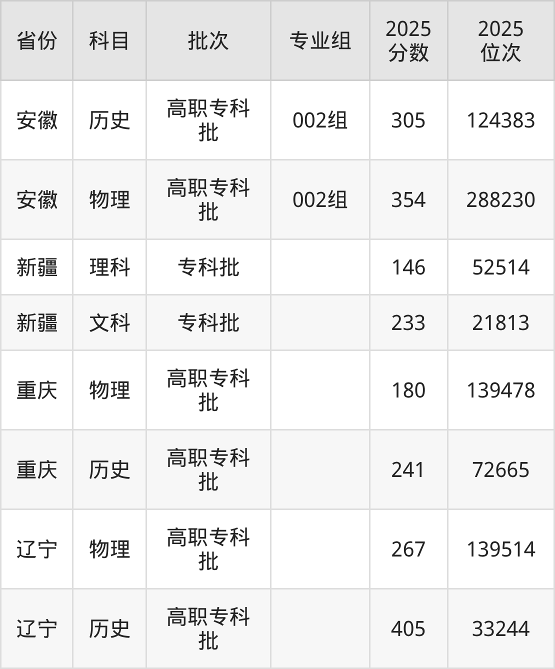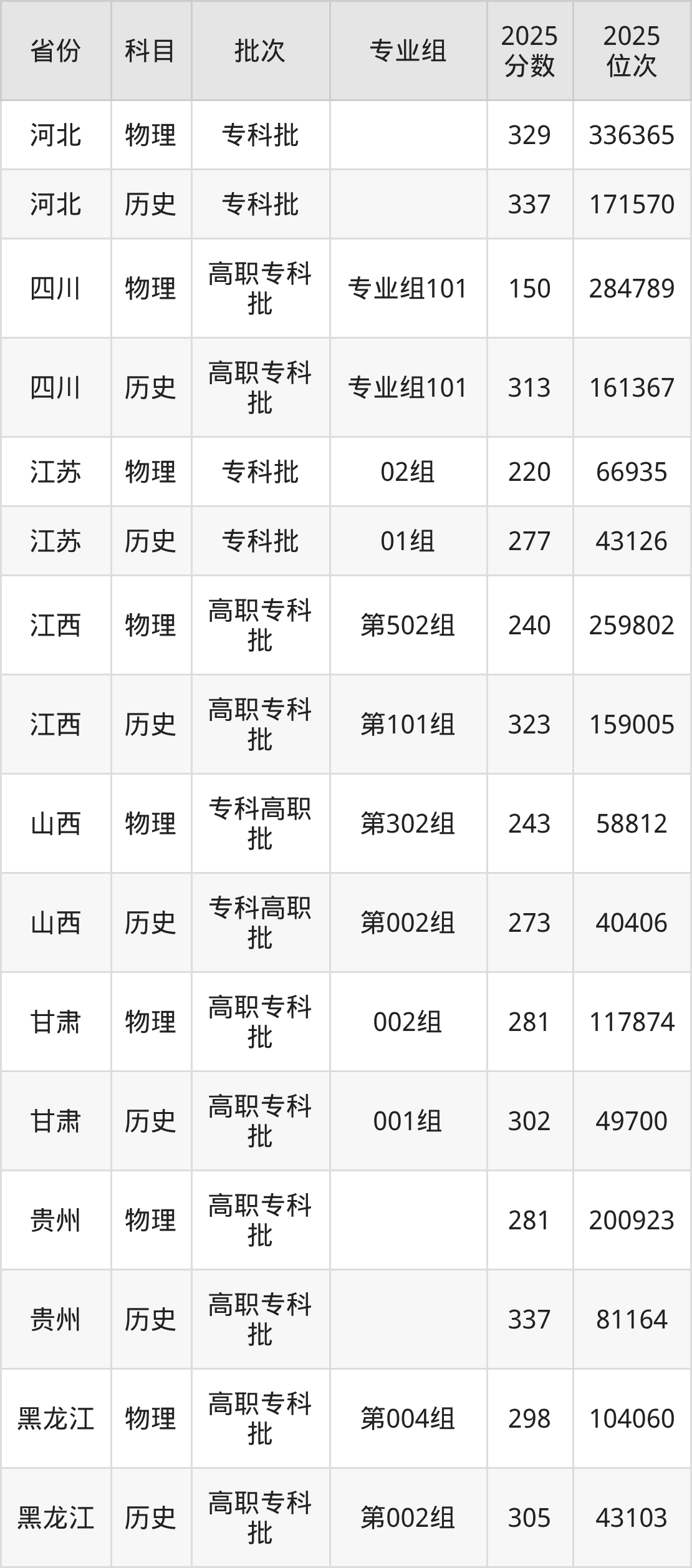 普通类专科物理类最低281分,专科历史类最低302分