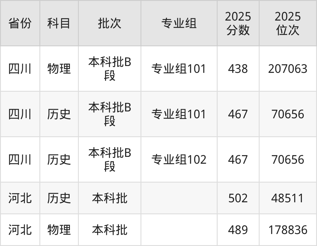 2025年成都艺术职业大学全国录取分数线是438分到502分,录取最低在四川物理类(专业组101)、录取最高在河北历史类。各省各专业组最低分具有差异,详情如下: